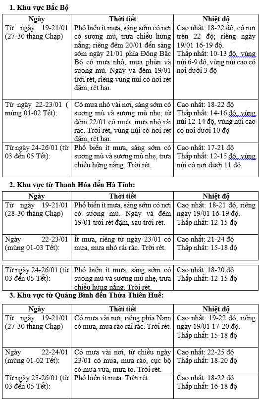 Tối 18/1, Trung tâm Dự báo Khí tượng thủy văn quốc gia đưa bản tin Nhận định thời tiết phục vụ dịp Tết Nguyên đán Quý Mão từ ngày 19/1 đến 26/1/2023 (tức từ ngày 28 tháng Chạp đến mùng 5 Tết).