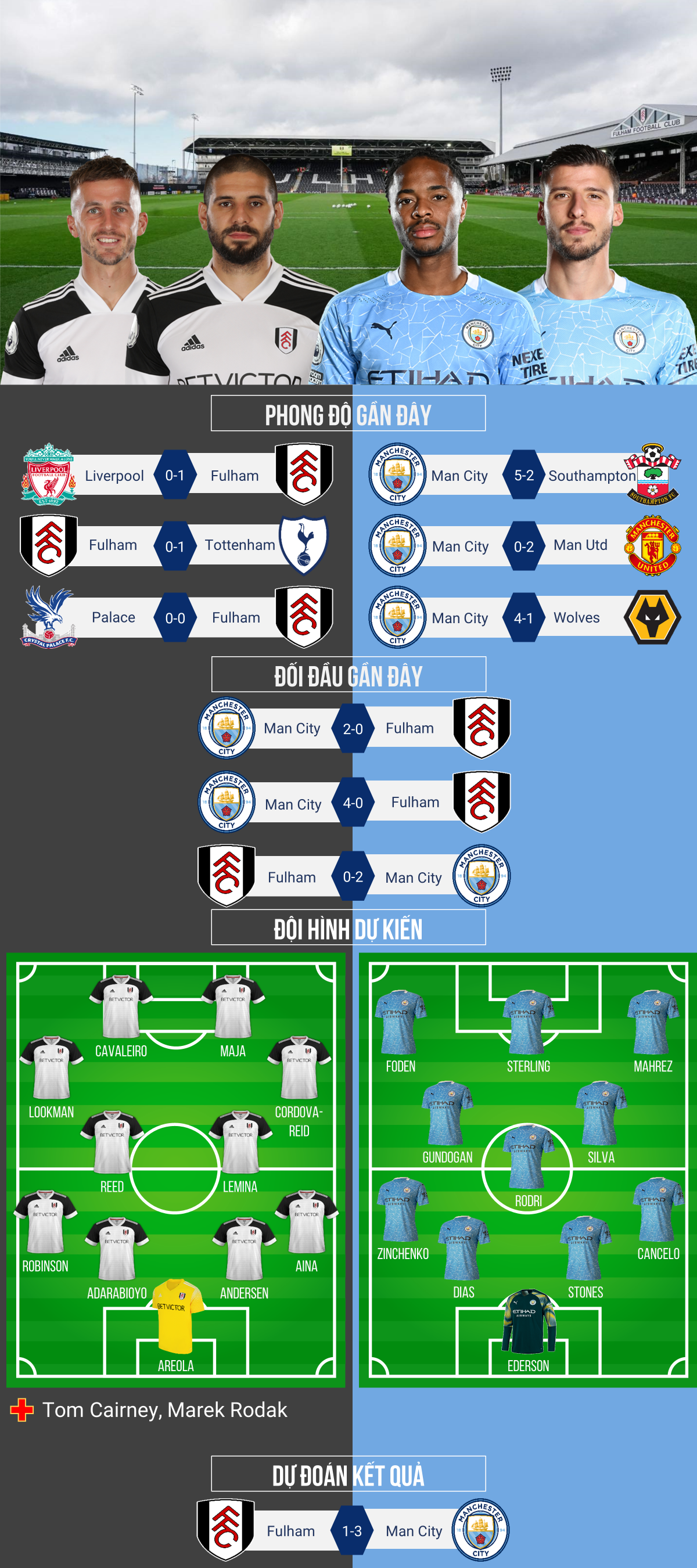 Dự đoán tỷ số, đội hình xuất phát trận Fulham - Man City Thứ Bảy 13/03/2021 08:59 (GMT+7) Dự đoán tỷ số, đội hình xuất phát trận đấu giữa Fulham và Man City trong khuôn khổ vòng 28 Premier League 2020/2021 diễn ra lúc 03h00 ngày 14/3 theo giờ Việt Nam.