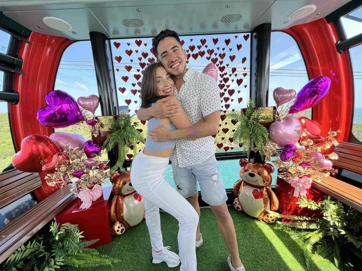 Nhiều du khách khác yêu thích một ngày Valentine nhộn nhịp ở Sun World Phu Quoc trên đảo Hòn Thơm. Ai nấy đều không khỏi bất ngờ khi được du ngoạn trong chiếc cabin tình yêu ngập tràn gấu bông, bóng bay và hoa tươi, phía dưới là vùng biển xanh như ngọc của Phú Quốc.