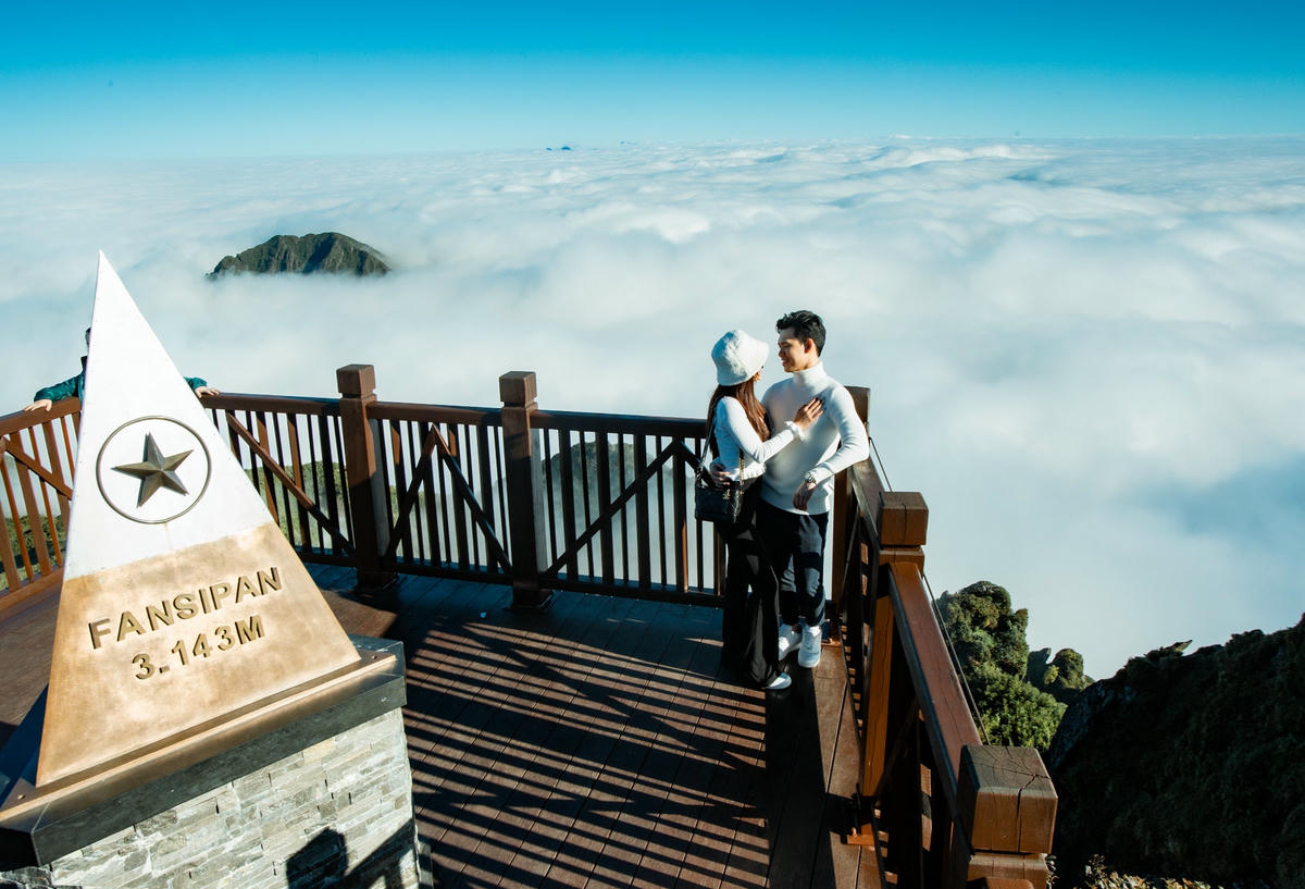 Cũng trong ngày Valentine, nhiều cặp đôi may mắn được chiêm ngưỡng khung cảnh huyền ảo nơi đỉnh thiêng Fansipan. Mây ngàn như suối thác trút về thung lũng tạo thành biển mây tít tắp tận chân trời, trong bảng lảng mây trắng là màu xanh thẳm của núi rừng Hoàng Liên, đẹp tựa tranh thủy mặc.