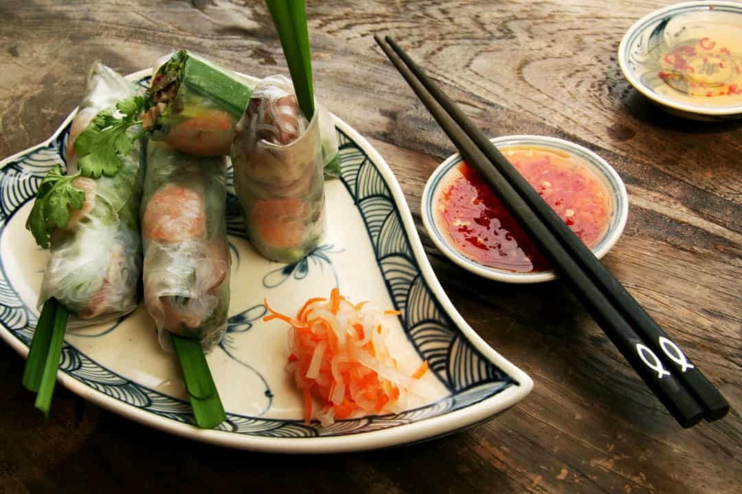Một món ăn vặt phổ biến của Việt Nam là Bánh Bao bánh Vạc, hay còn gọi là “bông hồng trắng”. Những miếng bánh nhỏ tinh tế được làm từ thịt heo băm nhỏ gói trong bánh tráng trắng, cuộn lại trông như một bông hồng. Chúng được phục vụ với hành tây chiên giòn ở trên.