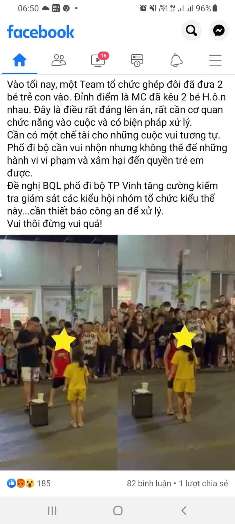 Trong sáng ngày 25/6, trên mạng xã hội lan truyền video 2 cháu nhỏ bị “ghép đôi” trên phố đi bộ TP Vinh. Ngay sau đó, dư luận dậy sóng, cho rằng đó là hành vi phản cảm, đồng thời yêu cầu xử lý.