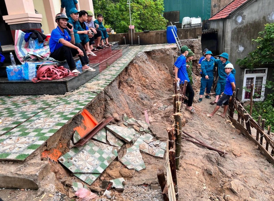 Tại thị xã Hoàng Mai, huyện Quỳnh Lưu, Nghi Lộc… cũng ghi nhận những thiệt hại nặng nề do mưa bão. Cụ thể, tại xã Quỳnh Lập, mưa lớn đã gây sạt lở nghiêm trọng, ảnh hưởng đến nhiều hộ dân. Đơn cử như tại gia đình ông Nguyễn Bá Khiêm, trú thôn Đồng Tiến, xã Quỳnh Lập, một phần mái bên nhà bị sạt lở, gia đình ông rất lo lắng. Ngay sau đó, chính quyền địa phương đã huy động lực lượng dùng cọc tre gia cố, vết sụt lún tại hộ ông Khiêm mới cơ bản được khống chế.