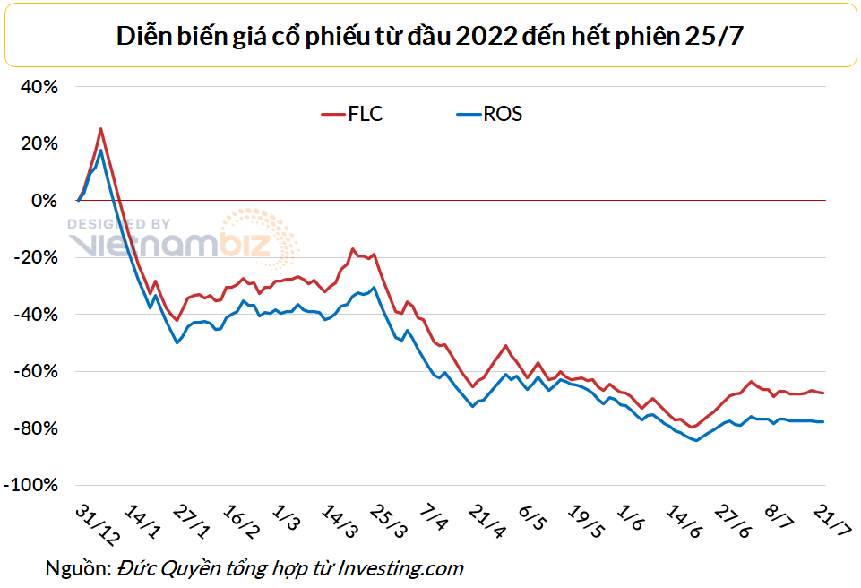 Kết phiên gần đây nhất 25/7, giá cổ phiếu ROS dừng ở 2.980 đồng/cp trong khi FLC dừng ở 5.560 đồng/cp. Biểu đồ dưới đây cho thấy giá cổ phiếu FLC và ROS hiện nay đều thấp hơn nhiều so với mức đầu năm 2022.