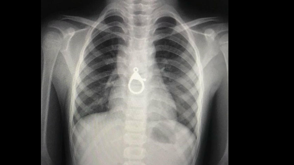 Sau khi tiếp nhận cháu H., các y, bác sĩ đã tiến hành thăm khám và chụp XQ ngực thì phát hiện một dị vật hình móc khóa ở trong vùng ngực cháu H..