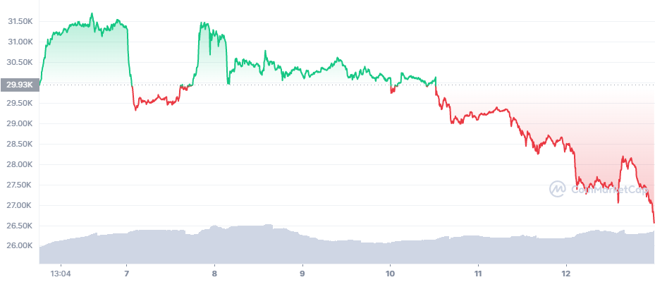 Theo dữ liệu từ CoinMarketCap, tính đến 6h50 ngày 13/6 (giờ Việt Nam), giá Bitcoin tiếp tục đà giảm từ cuối tuần xuống mức thấp kỷ lục là 26.825,70 USD, mất khoảng 5,41% trong vòng chỉ một ngày. Đây là mức đáy mà Bitcoin chưa từng chạm tới kể từ 12/2020.