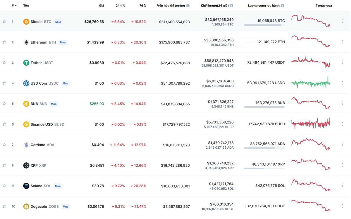 Tổng giá trị của toàn bộ thị trường tiền mã hóa giảm chỉ còn 1.092 tỷ USD. Các đồng tiền mã hóa khác đều có mức sụt giảm hai con số trong một tuần.
