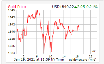 Tính đến 7h sáng ngày 20/1, giá vàng thế giới đang “neo” ở ngưỡng 1.842 USD/ounce, trước đó, giá vàng đã chạm mốc 1.845 USD/ounce. Diễn biến này cho thấy, giá vàng đã lấy lại được đà tăng, dù không có “bứt phá lớn”.