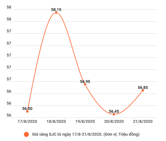 Trong tuần, thương hiệu vàng SJC có 2 phiên giảm giá và 3 phiên tăng giá, trong đó phiên tăng giá mạnh nhất lên tới 58,15 triệu đồng mỗi lượng.