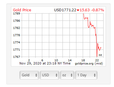 Ngày 30/11, mở phiên giao dịch tuần mới, giá vàng tiếp tục giảm mạnh, chỉ còn 1767 USD/ounce. Vào lúc 11h ngày 30/11 (theo giờ Việt Nam), giá vàng có dấu hiệu tăng nhẹ, duy trì ở mức 1770 USD/ounce.