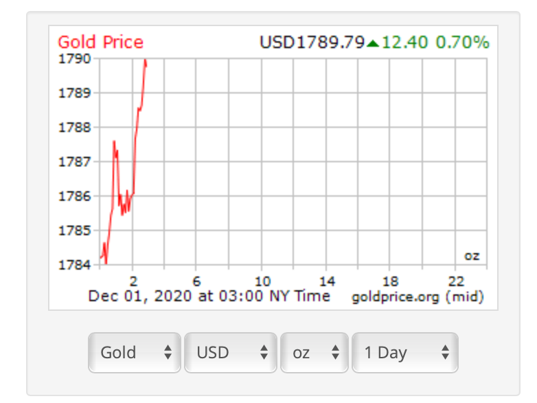 Vào 15h00 ngày 1/12 (theo giờ Việt Nam), giá vàng thế giới ở mức 1790 USD/ounce, tăng nhẹ so với thời điểm trước đó khoảng 6 USD/ounce.
