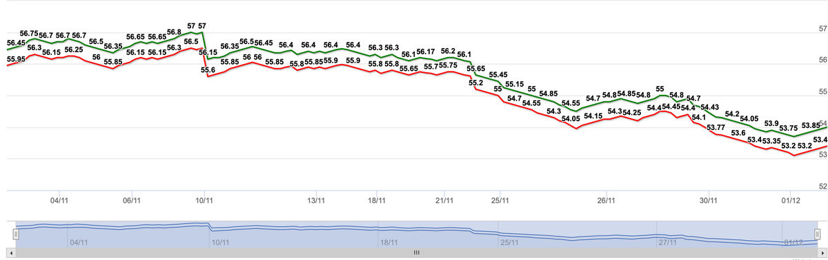 Ngày 1/12, giá vàng trong nước tiếp tục giảm mạnh. Trong phiên giao dịch sáng, Công ty Vàng bạc đá quý Sài Gòn niêm yết giá vàng SJC mua vào 53,1 triệu đồng/lượng, bán ra 53,72 triệu đồng/lượng. Vàng Doji niêm yết giá vàng SJC mua vào 52,9 triệu đồng/lượng, bán ra 53,6 triệu đồng/lượng.