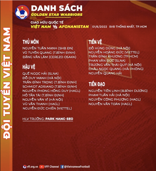 Thành phần của đội tuyển Việt Nam tham dự trận đấu giao hữu với Afghanistan vào ngày 1/6 tới, sẽ có 3 ngôi sao vừa cùng đội U23 Việt Nam giành HCV nội dung bóng đá nam SEA Games 31, gồm các tiền vệ Hoàng Đức, Hùng Dũng, cùng trung phong Nguyễn Tiến Linh. Đấy đều là các trụ cột của đội tuyển Việt Nam hiện nay, nên người hâm mộ sẽ càng hào hứng chứng kiến trận đấu trên sân Thống Nhất.