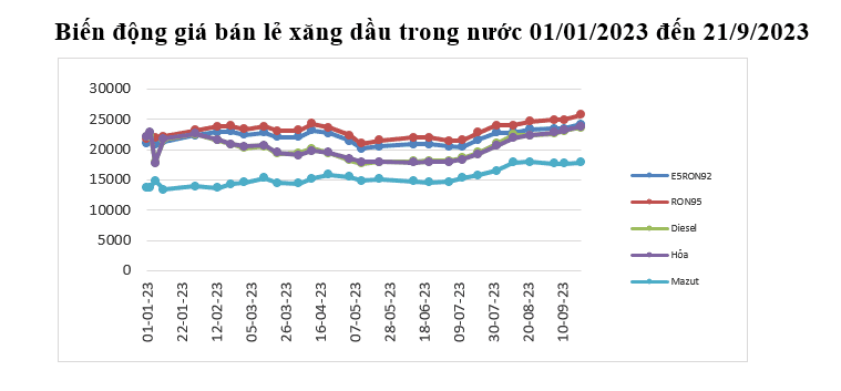 Chiều 21/9, Bộ Công Thương cập nhật thông tin điều hành giá xăng dầu cho biết: Thị trường xăng dầu thế giới kỳ điều hành lần này (từ ngày 11/9/2023 - 20/9/2023) chịu ảnh hưởng của các yếu tố như: Nhu cầu tăng cao trong khi OPEC+ kiềm chế nguồn cung, thắt chặt thị trường, triển vọng kinh tế tại Mỹ và Trung Quốc khả quan hơn trong khi tồn kho giảm, Fed quyết định giữ nguyên lãi suất cơ bản nhưng phát tín hiệu có thể có một đợt tăng khác vào cuối năm nay… Các yếu tố nêu trên khiến giá xăng dầu từ ngày 11/9 đến 20/9 có biến động tăng giảm đan xen nhưng xu thế chung là tăng.