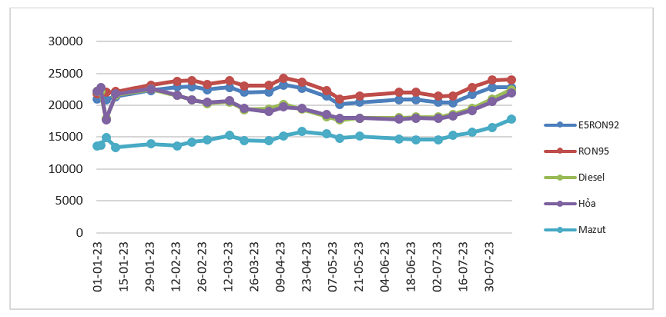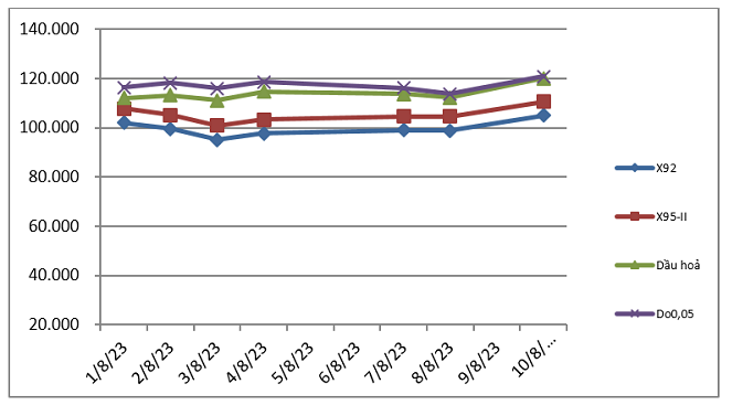 Cụ thể, bình quân giá thành phẩm xăng dầu thế giới giữa kỳ điều hành giá ngày 01/8/2023 và kỳ điều hành ngày 11/8/2023 là: 99,636 USD/thùng xăng RON92 dùng để pha chế xăng E5RON92 (giảm 0,053 USD/thùng, tương đương giảm 0,05% so với kỳ trước); 105,256 USD/thùng xăng RON95 (giảm 0,083 USD/thùng, tương đương giảm 0,08% so với kỳ trước).