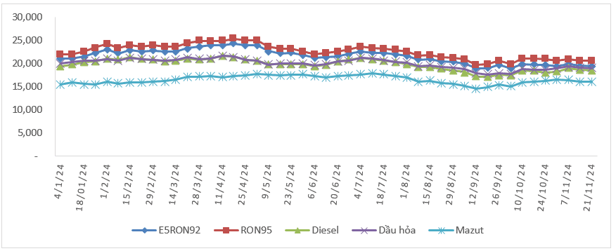 Giá bán các mặt hàng xăng dầu tiêu dùng phổ biến trên thị trường từ 15h00 chiều 21/11 như sau: