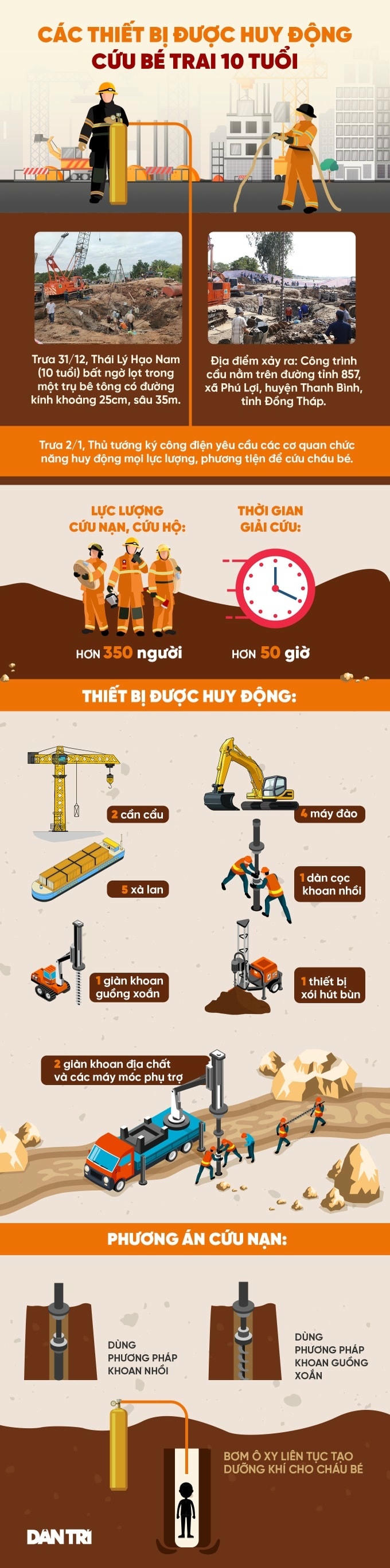 Trước đó, như tin đã đưa, trưa 31/12/2022, bé trai Thái Lý Hạo Nam (10 tuổi) cùng 3 người bạn vào công trình dự án cầu kênh Rọc Sen thuộc ấp 2, xã Phú Lợi, huyện Thanh Bình, tỉnh Đồng Tháp. Tại đây, Nam bất ngờ lọt trong một trụ bê tông có đường kính khoảng 25cm, được khoan cắm sâu xuống lòng đất.