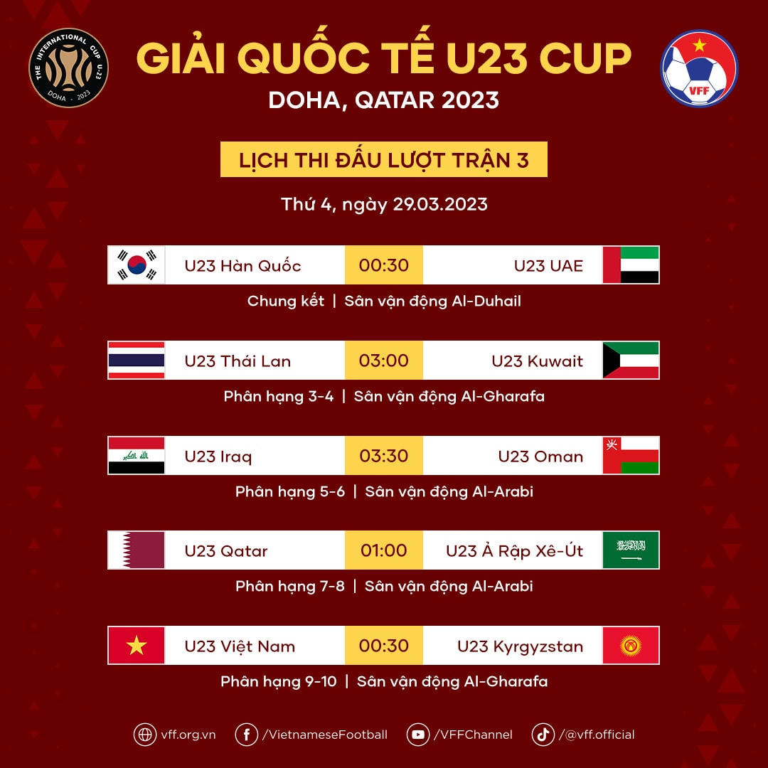 Theo đó, U23 Việt Nam sẽ đối đầu U23 Kyrgyzstan trong trận tranh hạng chín. Hai cặp đấu phân định vị trí năm-sáu và bảy-tám gồm U23 Iraq-U23 Oman và U23 Saudi Arabia-U23 Qatar.