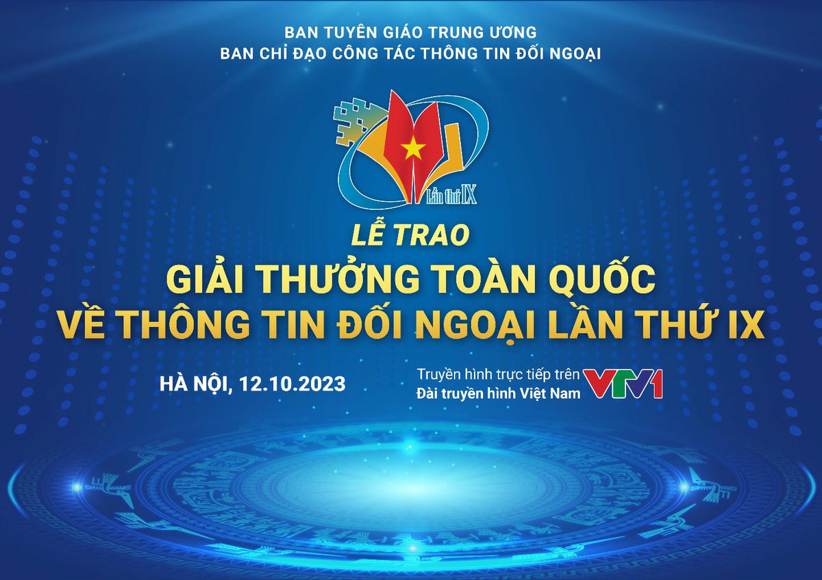 Lễ trao giải thưởng toàn quốc về thông tin đối ngoại lần thứ IX diễn ra vào 20h00 ngày 12/10/2023, tại Nhà hát Lớn Hà Nội (Số 1 Tràng Tiền, Hoàn Kiếm, TP Hà Nội) và tường thuật trực tiếp trên kênh VTV1 Đài Truyền hình Việt Nam.