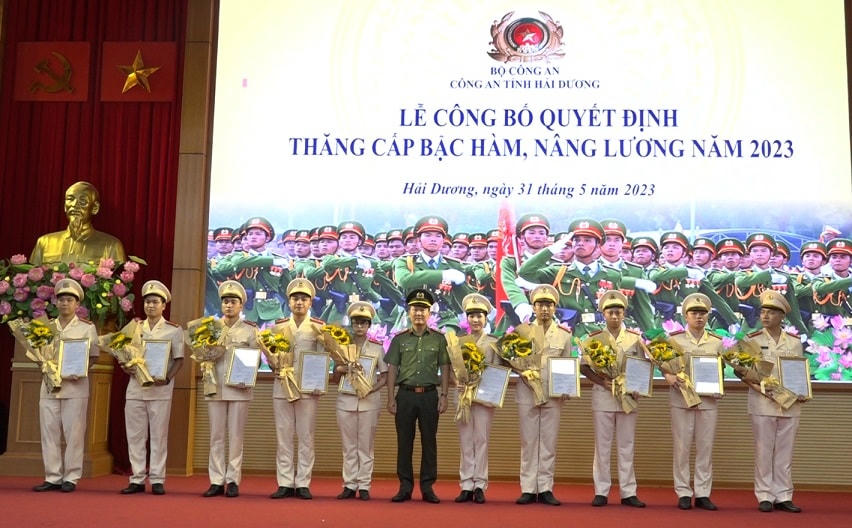 Ngày 31/5, Công an tỉnh Hải Dương tổ chức lễ công bố các quyết định của Bộ trưởng Bộ Công an và Giám đốc Công an tỉnh về việc thăng cấp bậc hàm, nâng bậc lương năm 2023 cho cán bộ, chiến sĩ.