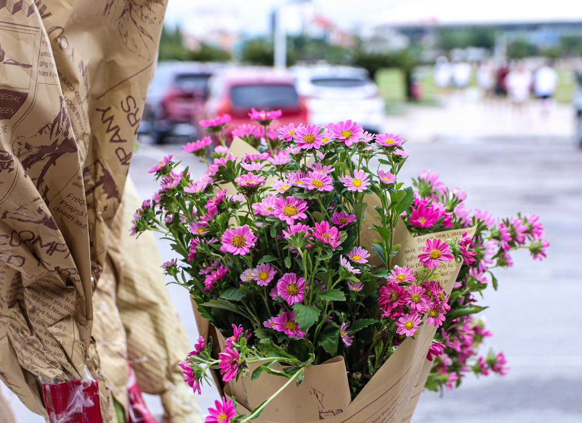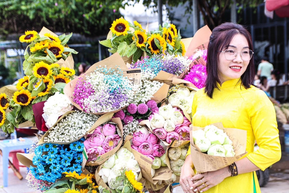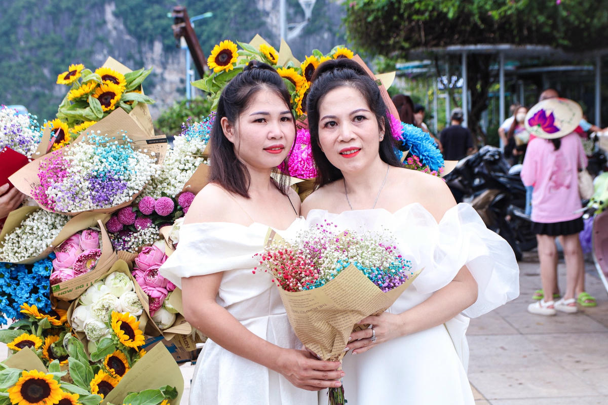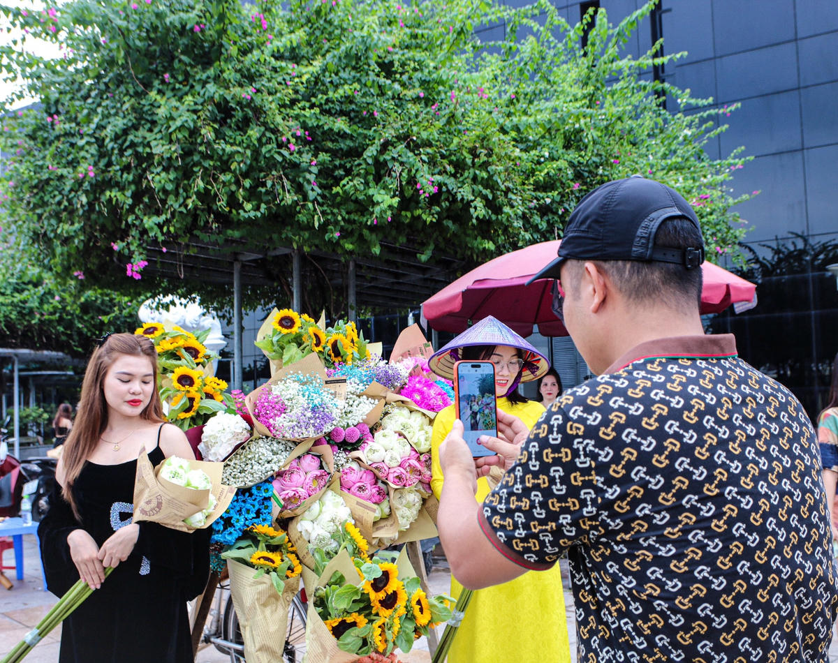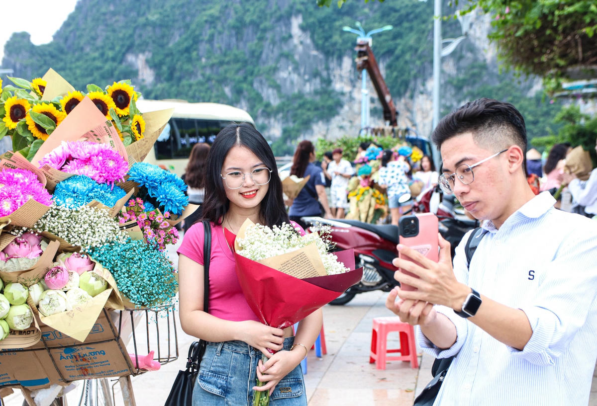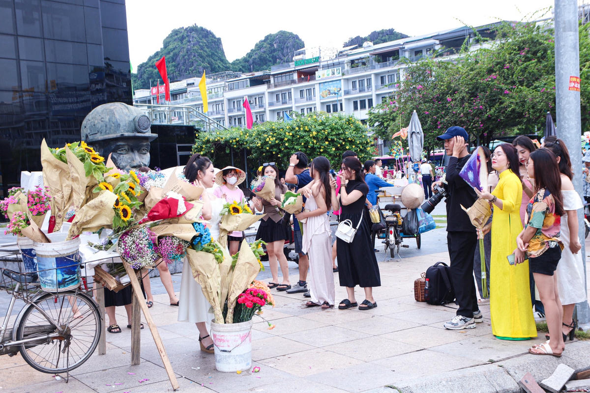Hình ảnh chiếc xe đạp chở hoa “gói trọn” cả mùa thu vốn quen thuộc trên những con đường, tuyến phố Hà Nội nay đã được mang về với thành phố bên bờ di sản. Hòa cùng với tiếng gió biển và những ngọn núi trùng điệp ngoài xa, những sắc màu rực rỡ của muôn hoa đã tạo nên cho Hạ Long bầu không khí lãng mạn và rất nên thơ. Những bó hoa ngập tràn sắc màu làm bừng sáng một góc phố bên bờ di sản vịnh Hạ Long.Mặc dù phải xếp hàng để được chụp ảnh cùng chiếc xe hoa, thế nhưng ai nấy đều vô cùng hào hứng và vui vẻ. Bạn Hoàng Ngân (phường Hồng Hà, TP Hạ Long) chia sẻ: “Mình tranh thủ ngày nghỉ để đến đây chụp ảnh, chiếc xe hoa này làm mình nhớ lại những ngày tháng học tập và làm việc tại Hà Nội. Mình thấy chiếc xe rất đẹp và ấn tượng”.Bạn Nguyễn Thị Phương cùng chồng vượt hơn 30 km từ TP Uông Bí xuống TP Hạ Long để chụp ảnh cùng chiếc xe hoa. Cô bạn trẻ cho biết mình cảm thấy rất hứng thú với chiếc xe đạp chở hoa và mong muốn có thật nhiều bức ảnh đẹp để ghi lại kỉ niệm.Rất đông người dân mặc áo dài để chụp ảnh nhằm lưu giữ lại những khoảnh khắc đặc biệt của mùa thu giữa rực rỡ sắc hoa.Những bó hoa được nhập trực tiếp từ chợ hoa Quảng Bá - chợ hoa đầu mối nổi tiếng ở Hà Nội và được chuyển về ngay trong ngày để đảm bảo hoa luôn được đẹp và tươi lâu nhất, phục vụ người dân và du khách đến chụp ảnh.Sau khi tham quan Bảo tàng Quảng Ninh, nhóm bạn quyết định ra chụp ảnh vì ấn tượng bởi những sắc màu rực rỡ của rất nhiều loại hoa.Bạn trẻ tạo dáng chụp ảnh trước xe hoa tại Công viên Lán Bè.