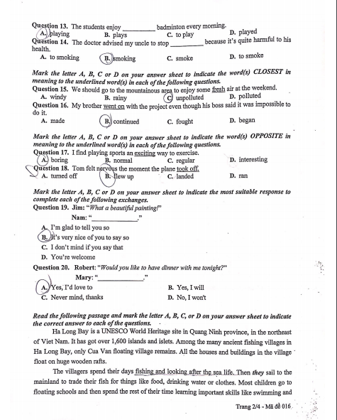 Đề thi và gợi ý đáp án môn tiếng Anh (mã đề 016):