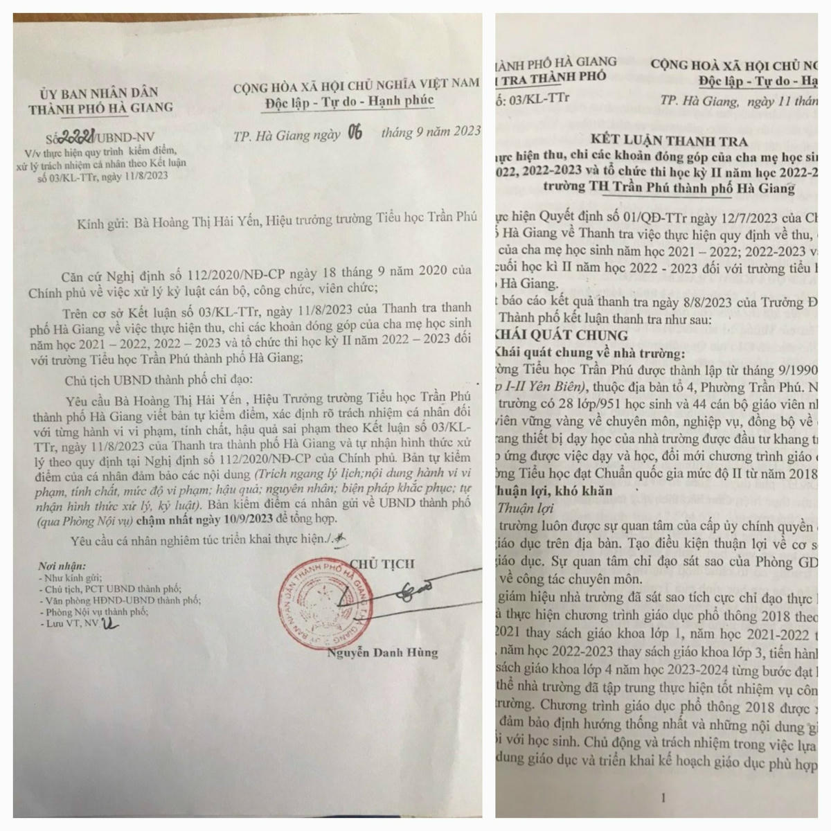 Vừa qua, UBND TP Hà Giang (tỉnh Hà Giang) ban hành văn bản yêu cầu bà Hoàng Thị Hải Yến, Hiệu trưởng Trường tiểu học Trần Phú, phải viết bản tự kiểm điểm, xác định rõ trách nhiệm cá nhân đối với từng hành vi vi phạm, tính chất, hậu quả sai phạm theo Kết luận thanh tra số 03/KL-TTr của Thanh tra TP Hà Giang và tự nhận hình thức xử lý theo quy định tại Nghị định số 112/2020/NĐ-CP của Chính phủ.