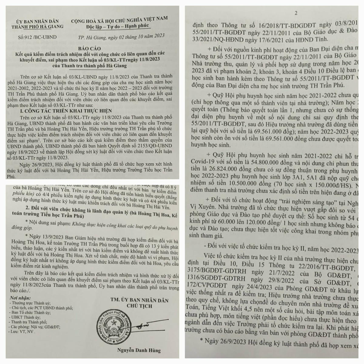 Trên cơ sở Kết luận thanh tra về việc thu – chi các khoản đóng góp của cha mẹ học và việc tổ chức thi học kỳ đối với Trường tiểu học Trần Phú (TP Hà Giang, tỉnh Hà Giang), UBND TP Hà Giang đã ban hành văn bản Báo cáo kết quả kiểm điểm sau những khuyết điểm, sai phạm đối với viên chức lãnh đạo quản lý và viên chức không là lãnh đạo quản lý của Trường tiểu học Trần Phú.
