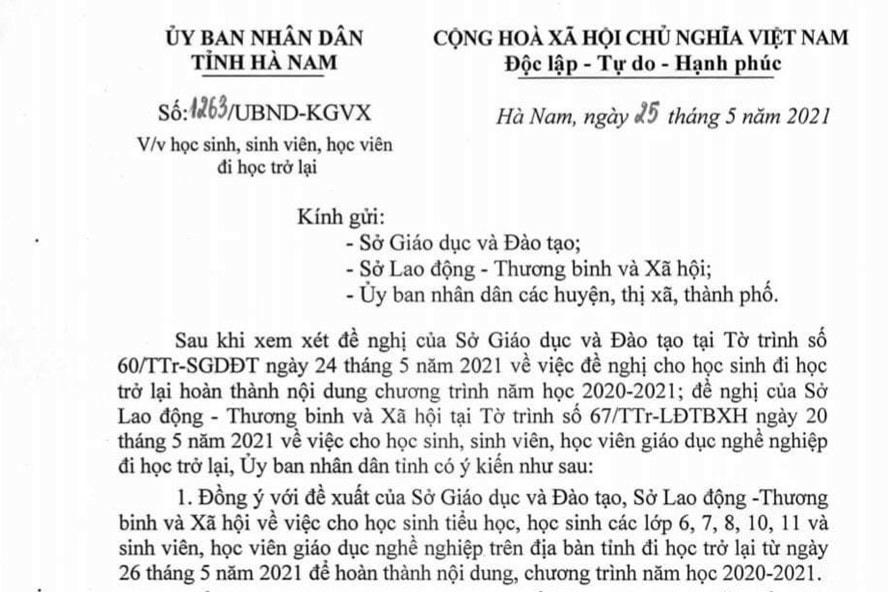 Ngày 25/5, ông Trần Xuân Dưỡng, Phó Chủ tịch UBND tỉnh Hà Nam đã ký ban hành công văn số 1263/UBND-KGVX về việc cho học sinh, sinh viên, học viên trên địa bàn tỉnh đi học trở lại.
