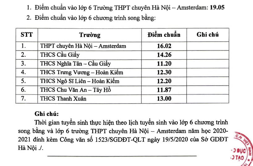 Ngày 4/8, Phó Giám đốc Sở GDĐT Hà Nội Lê Ngọc Quang đã ký quyết định phê duyệt điểm chuẩn trúng tuyển bổ sung vào lớp 6 song bằng năm học 2020-2021.