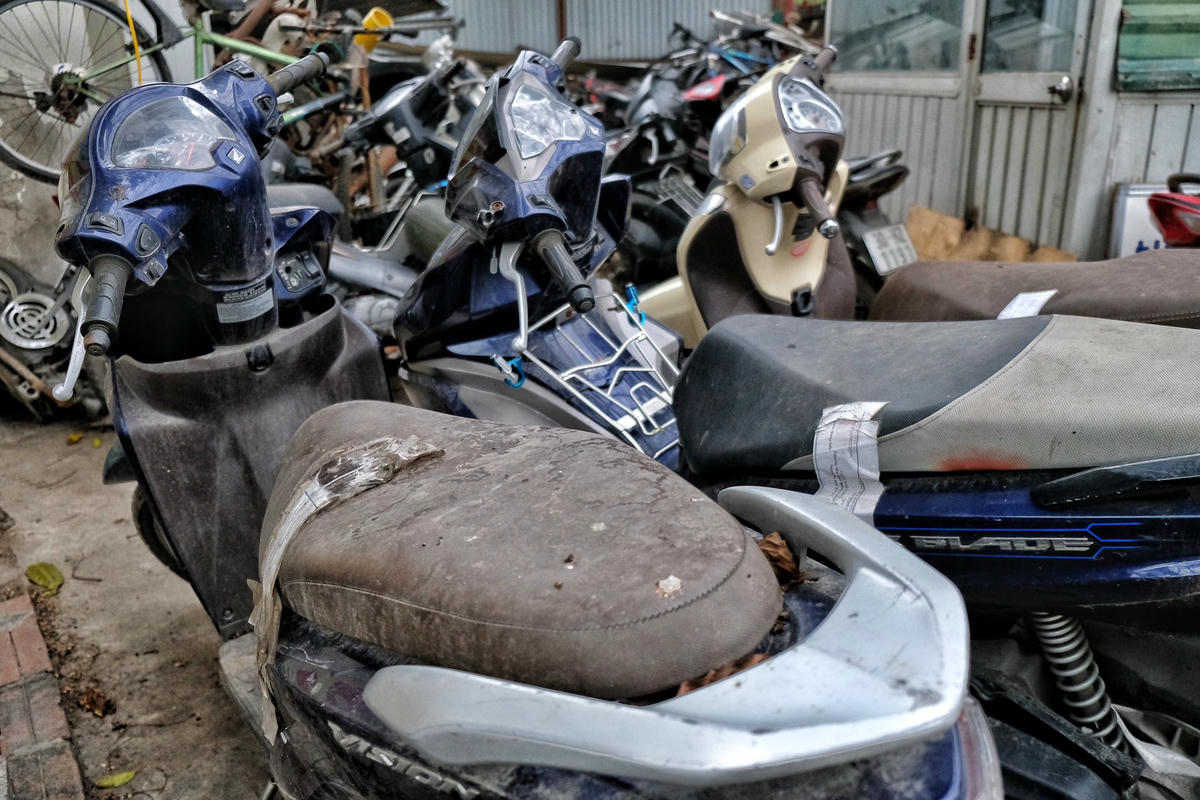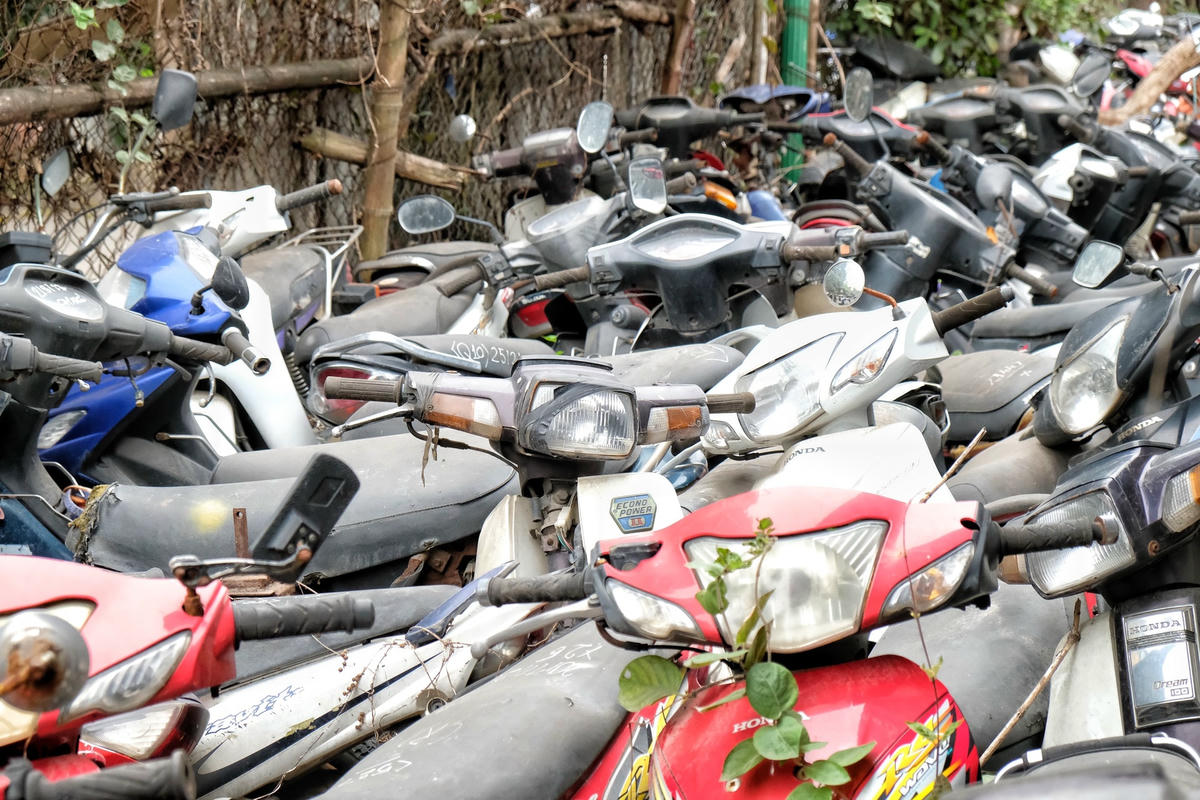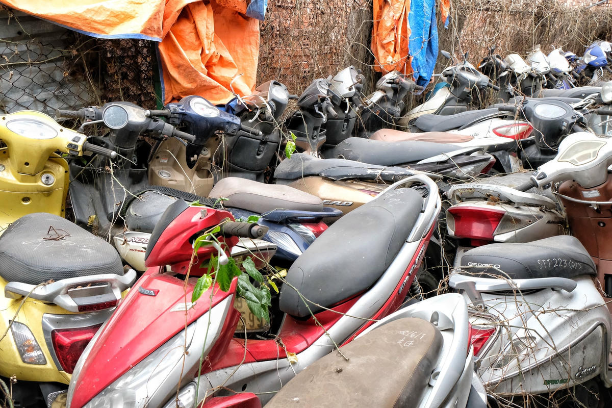 Thời gian qua, nhất là từ khi triển khai cao điểm xử lý vi phạm nồng độ cồn, bãi trông giữ xe vi phạm luôn trong cảnh quá tải vì chủ xe không đến làm thủ tục để đưa xe về. Vì vậy, hàng nghìn chiếc xe máy đủ loại từ mới đến cũ nát được tập kết, chất đống phủ đầy cỏ dại.