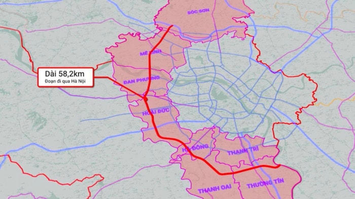 Đặc biệt, đối với đoạn đi trùng đê sông Đáy hiện trạng (khoảng từ Km14+700 đến Km16+600 lý trình), điều chỉnh quy mô mặt cắt ngang đường dao động từ 112,5 m đến 152,5 m, trong đó thành phần cao tốc, đường gom song hành phía Tây và dải đất dự trữ bố trí tuyến đường sắt quốc gia vành đai giữ nguyên, thống nhất với toàn tuyến; mở rộng mặt để kết hợp là đường gom song hành phía Đông tuyến đường.