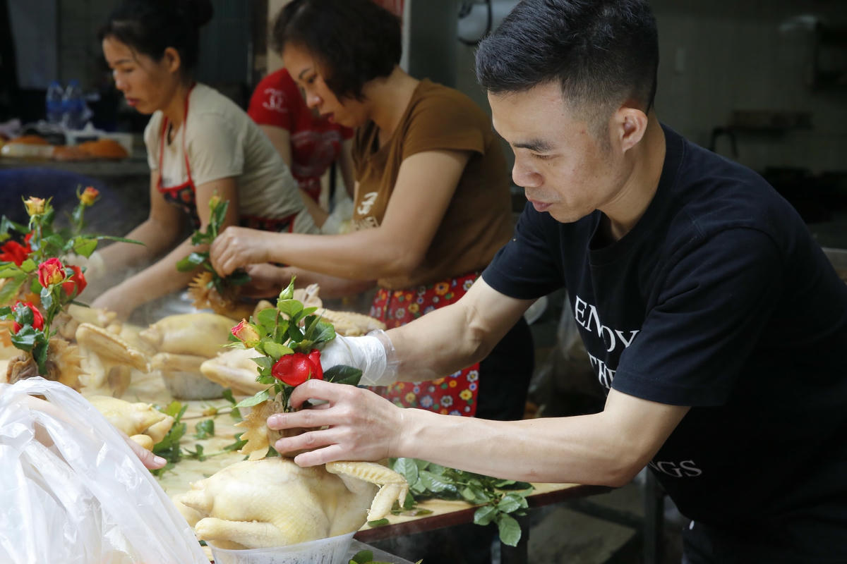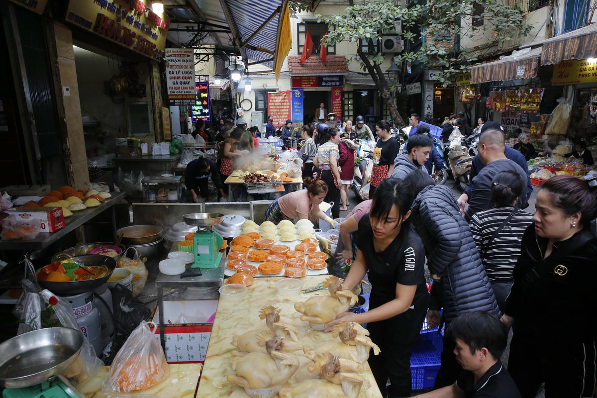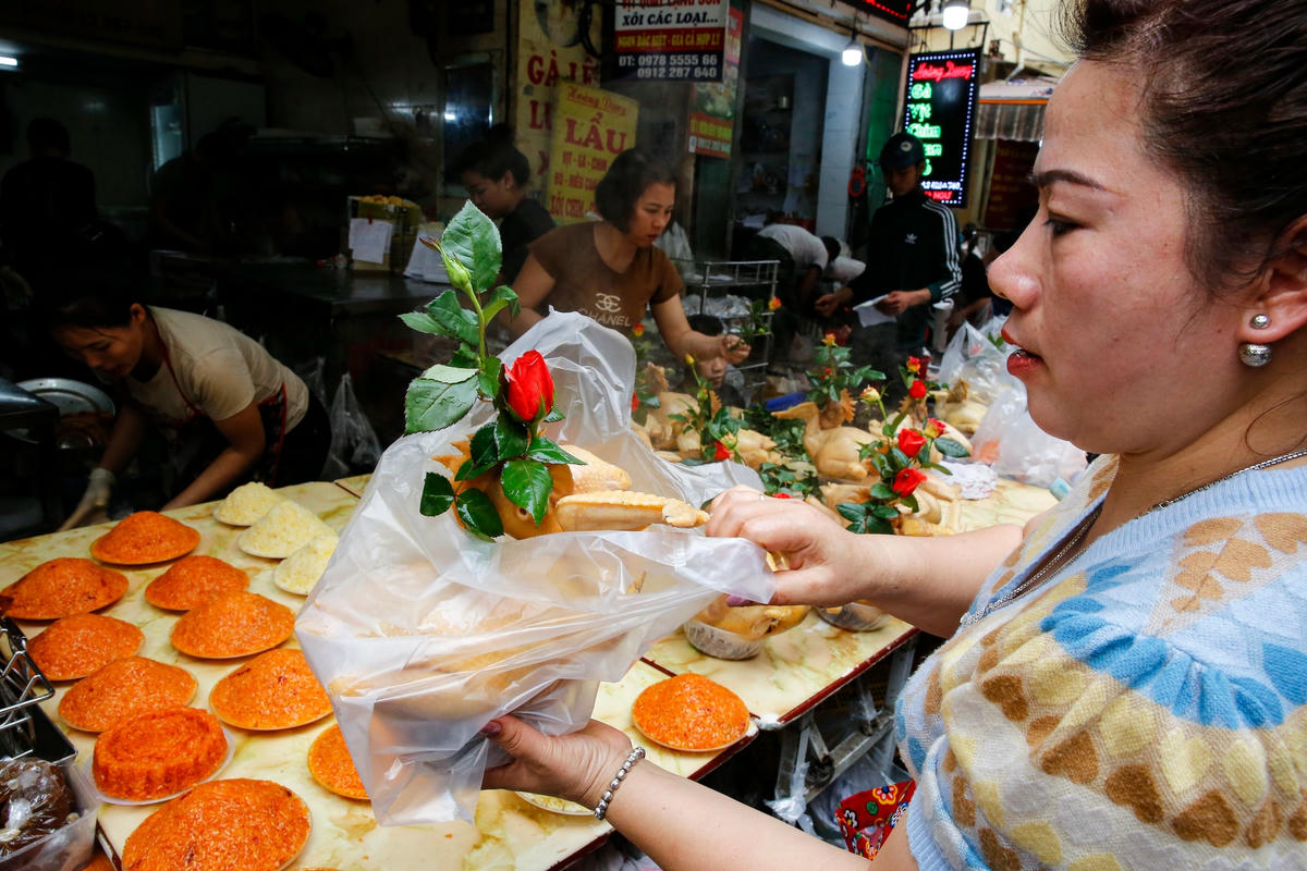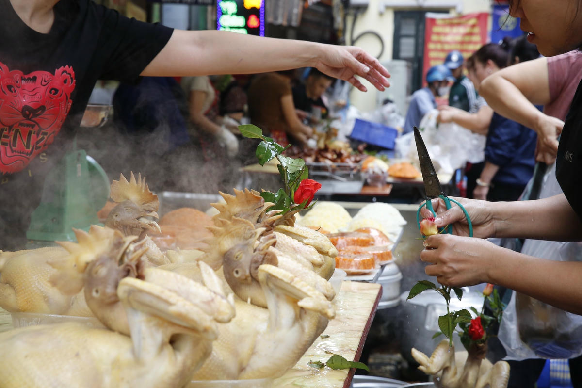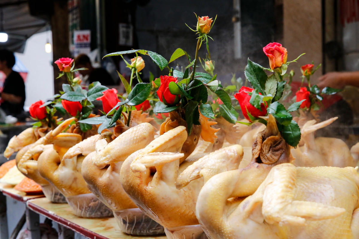 Trong dịp Tết ông Công ông Táo, giá đồ lễ gà ngậm hoa hồng, chim quay, xôi nem... tại chợ Hàng Bè cao ngất ngưởng. Song những mặt hàng này vẫn có rất đông khách đến mua.