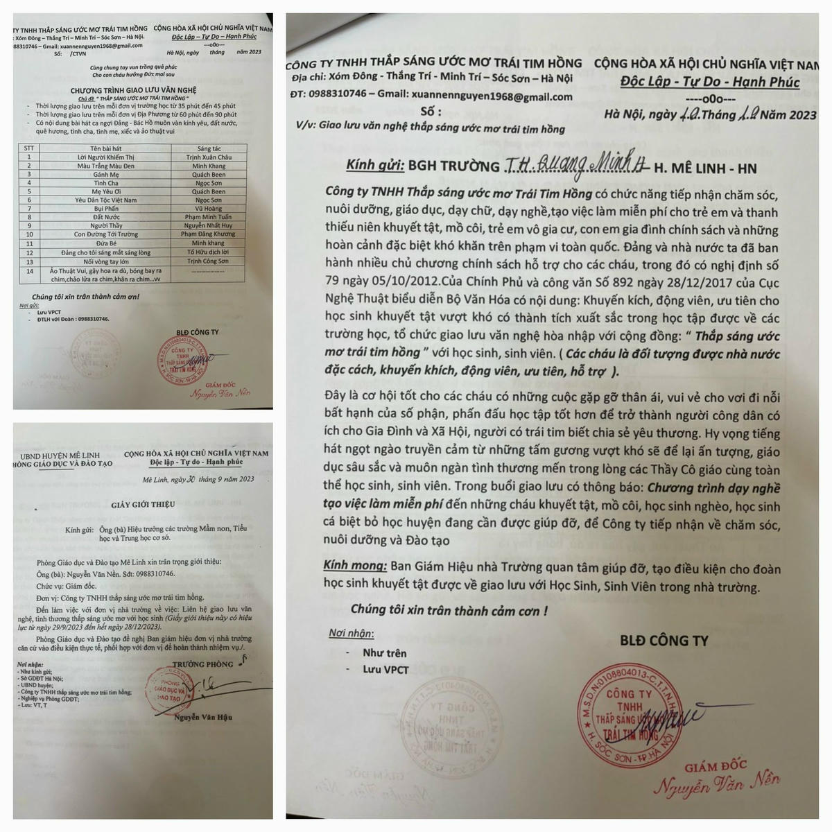 Có được văn bản giới thiệu của Phòng GDĐT huyện Mê Linh, Công ty TNHH Thắp sáng ước mơ trái tim hồng (địa chỉ tại xóm Đông, thôn Thắng Trí, xã Minh Trí, huyện Sóc Sơn, TP Hà Nội) đã gửi văn bản thể hiện nội dung và kịch bản chương trình đến các trường học với lời giới thiệu: Công ty có chức năng tiếp nhận chăm sóc, nuôi dưỡng, giáo dục, dạy chữ, dạy nghề, tạo việc làm miễn phí cho trẻ em và thanh thiếu niên khuyết tật, mồ côi, trẻ vô gia cư, con em gia đình chính sách và những hoàn cảnh khó khăn trên phạm vi toàn quốc… và nhiều những căn cứ, lý do, mục đích nhân văn, nhân đạo khác để được nhà trường tiếp nhận, tổ chức hoạt động biểu diễn.