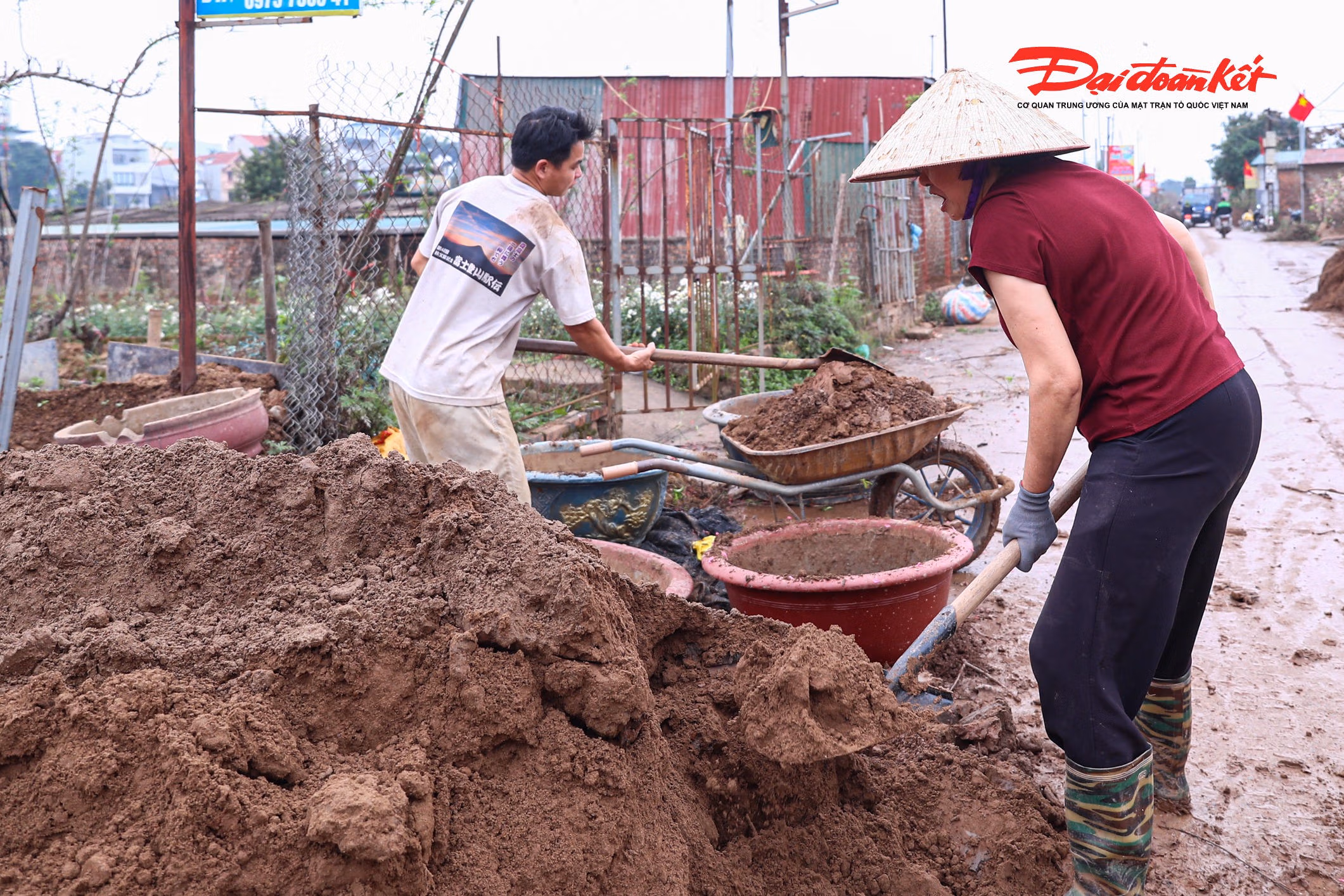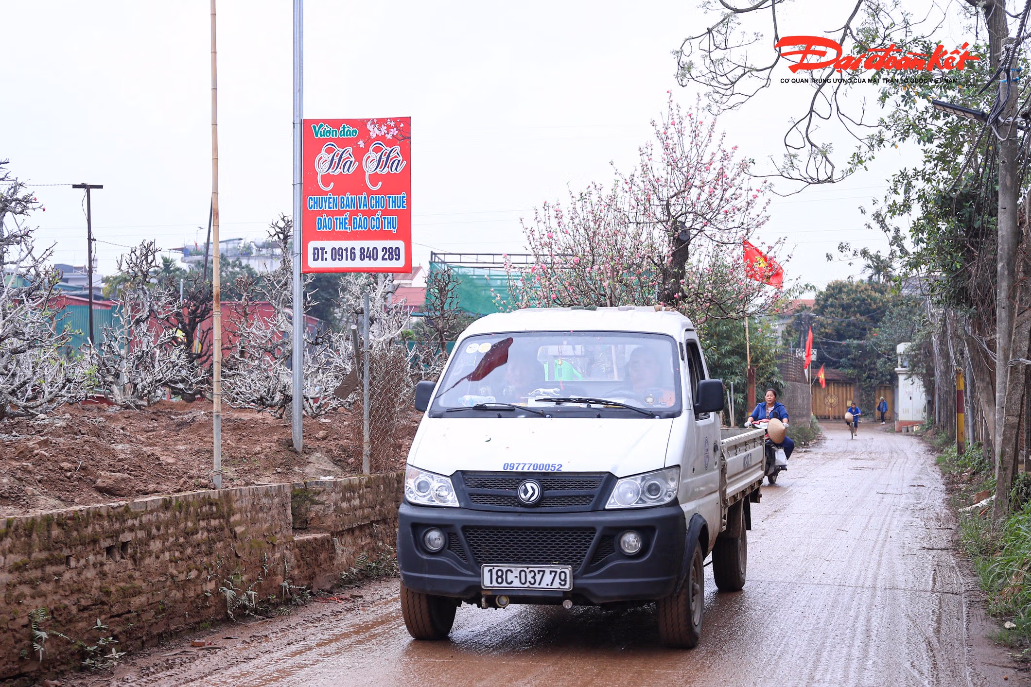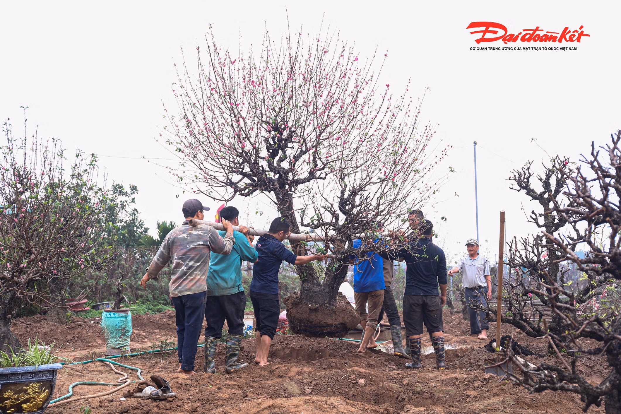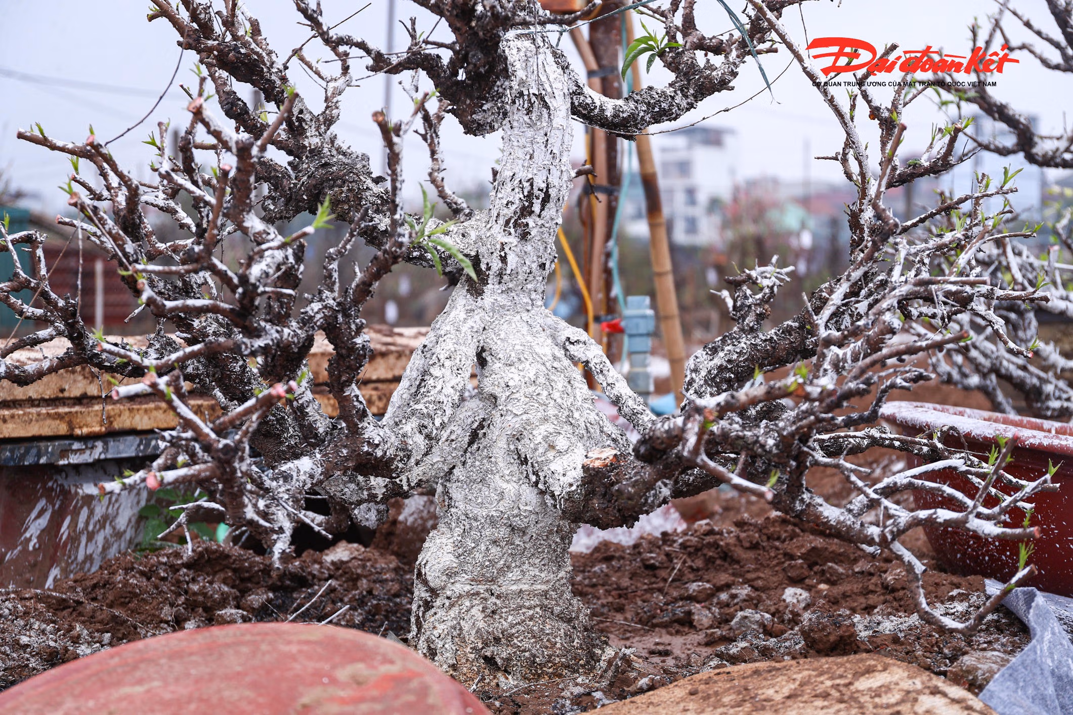 Sau khi được đưa về vườn, nhiều gốc đào được rắc một lớp vôi bột quanh gốc để khử khuẩn, phòng ngừa nấm bệnh và cải tạo đất. Đồng thời, biện pháp này cũng giúp kìm hãm sinh trưởng trong giai đoạn đầu, tránh cây bật lộc quá sớm, tạo nền tảng để phát triển ổn định và đạt chất lượng tốt nhất vào dịp Tết năm sau.