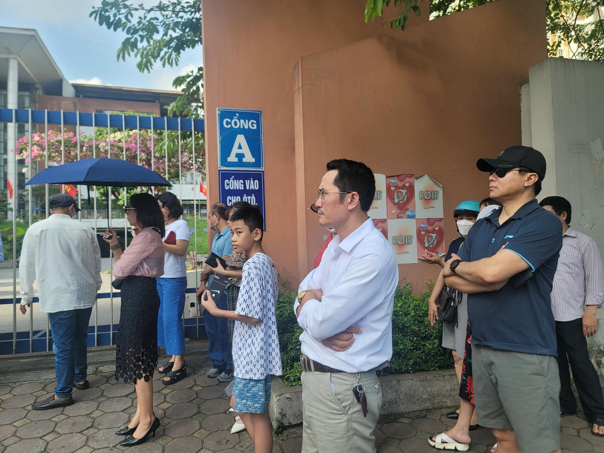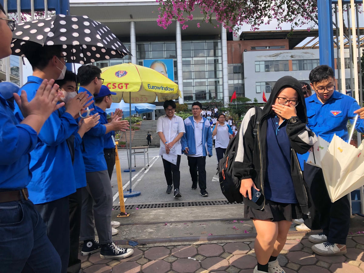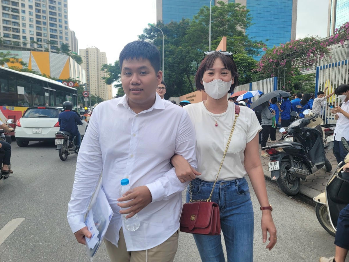 Bên ngoài, càng gần hết thời gian làm bài, phụ huynh càng mong ngóng.Em Thái Hưng, học sinh Trường THPT Chuyên Hà Nội - Amsterdam là thí sinh bước ra đầu tiên tại điểm thi Trường THPT Chuyên Hà Nội - Amsterdam với khuôn mặt vui tươi, hớn hở.Các thí sinh ra ngoài khu vực thi với những tâm trạng khác nhau.Nhiều thí sinh tự tin làm được từ 70 - 80% lượng đề thi.Có thí sinh cảm thấy "sốc" vì đề thi lạ.Thí sinh bước ra trong tràng pháo tay chào đón, động viên của các anh chị sinh viên tình nguyện.Phần lớn thí sinh được phụ huynh chờ sẵn đón ngay sau khi ra khỏi khu vực thi.Một số ít thí sinh tự chủ động đi thi.