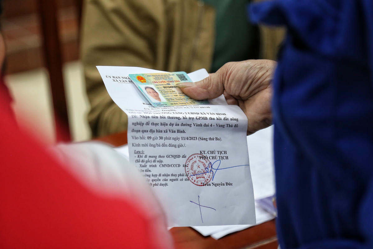 Ngày 11/4 Trung tâm Phát triển Quỹ đất huyện Thường Tín phối hợp với UBND xã Văn Bình tổ chức chi trả kinh phí bồi thường, hỗ trợ cho hơn 100 hộ dân với số tiền 80 tỷ đồng nằm trong chỉ giới đường đỏ thu hồi đất phục vụ giải phóng mặt bằng (GPMB) dự án đầu tư xây dựng đường Vành đai 4 - Vùng Thủ đô.Theo ghi nhận của PV Báo Đại Đoàn Kết, ngay từ 9h30 sáng 11/4 tại UBND xã Văn Bình, Ban tổ chức đã bố trí sẵn sàng cán bộ, lực lượng an ninh cũng như bàn ghế, nước uống để phục vụ người dân đến nhận tiền chi trả bồi thường, hỗ trợ.Các hộ dân khi đến đều được hướng dẫn thực hiện tuần tự các bước để nhận tiền chi trả khoa học, nhanh gọn và an toàn.Chị Trần Thị Hương, người dân xã Văn Bình chia sẻ: "Gia đình tôi có hơn 1.500 m2 đất bị thu hồi để thực hiện dự án. Tôi rất phấn khởi chỉ trong thời gian ngắn từ khi được phổ biến, quán triệt về GPMB phục vụ thi công đường Vành đai 4, đến nay gia đình tôi đã được nhận được 1,2 tỷ đồng đồng kinh phí bồi thường, hỗ trợ".Theo chị Hương, cán bộ từ huyện đến xã, thôn luôn công khai, minh mạch các bước triển khai, thực hiện GPMB, thu hồi đất, kiểm đếm, thông báo phương án, thời gian chi trả… nên chị hoàn toàn tin tưởng và hài lòng.Dù đất bị thu hồi nhưng người dân đều rất phấn khởi khi được Nhà nước chi trả với số tiền hợp lý.Ngay sau khi được nhận tiền, người dân đã ngay lập tức gửi tiền vào ngân hàng để tiết kiệm dưỡng già.Người dân làm thủ tục nhận tiền đền bù.