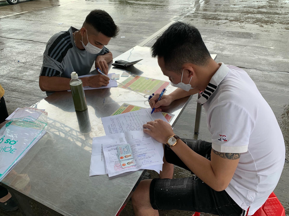 Sau đó tới bàn nộp cho nhân viên y tế trực chốt. Mất ít phút để nhân viên y tế kiểm tra đối chiếu thông tin của anh. Kiểm tra xong, người nhân viên y tế này mới đóng dấu mực màu xanh lên tay anh, rồi sau đó anh Thuyên mới được lên xe qua chốt.