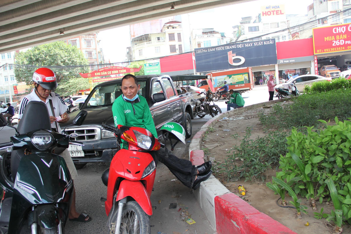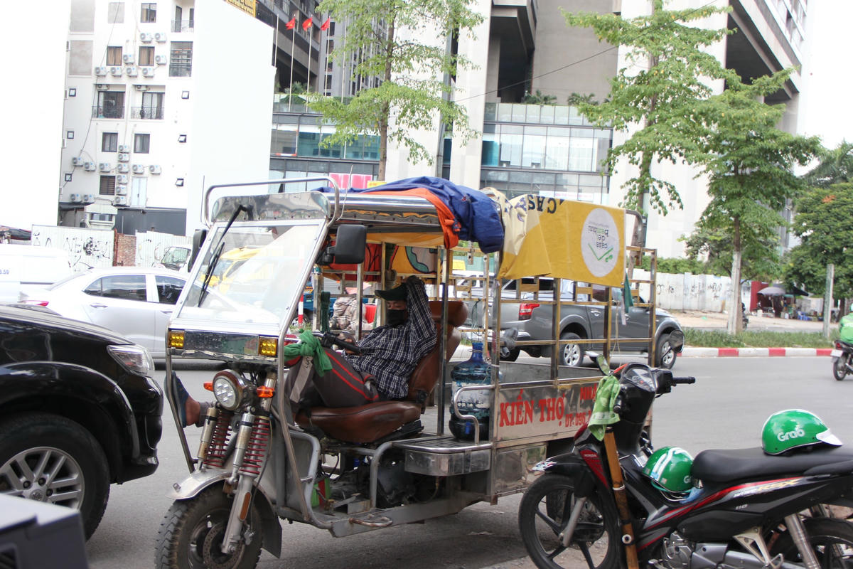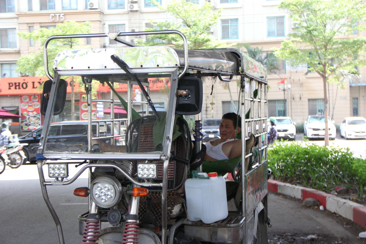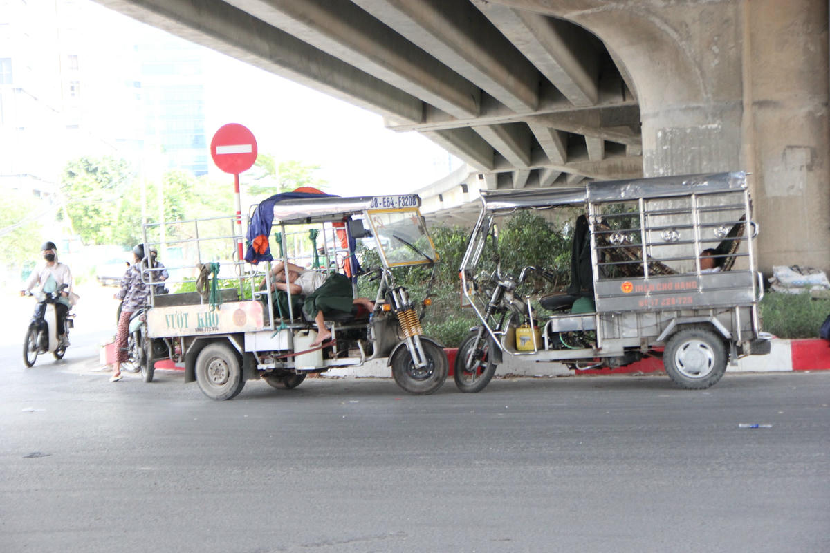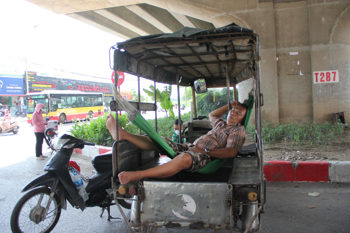 Theo ghi nhận của PV, dưới cái nắng gay gắt giữa trưa hè nhiều tài xế xe ôm công nghệ, lái xe ba gác… phải vạ vật ở những quán nước, gầm cầu, bóng cây để nghỉ ngơi tránh nắng.Để tránh cái nắng gay gắt 40 độ giữa trưa hè ở Thủ đô Hà Nội nhiều lái xe ba gác đành phải nghỉ trưa trên phương tiện "câu cơm" của mình ở gầm cầu vành đai 3.Còn những trường hợp khác kiếm bóng râm nghỉ ngơi hoặc ngồi vạ vật giữa lòng đường, vỉa hè. Đối với số đông tài xế xe ôm công nghệ thì kiếm những quán nước ngồi để nghỉ ngơi, uống nước giải khát giữa trưa là một phương án hữu hiệu nhất.Còn không thì chọn cách nghỉ ngơi dưới bóng cây gần bến xe, cổng làng, trạm xe buýt để tiện đón khách.Những lúc nắng nóng, oi ả mà có chiếc quạt mini cầm tay cũng phần nào xua bớt đi cái nóng nực.Anh Phan Văn H., quê ở Thanh Hóa cho biết: "Ngày trước chạy xe ôm công nghệ lúc xăng rẻ thì mỗi ngày trừ chi phí ra vẫn để dư được 200 - 300 nghìn đồng. Nhưng bây giờ thì khó kiếm được như thế, từ sáng đến giờ chạy 2 cuốc xe kiếm được 100 nghìn đồng thì đổ xăng mất 70 nghìn đồng. Còn 30 nghìn đồng thì không đủ tiền ăn mì tôm và uống nước giữa thời tiết nắng như thế này".