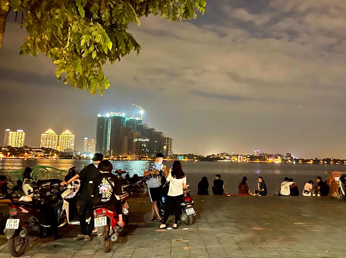 Ngay sau khi nhiều quận huyện tại Hà Nội được nới lỏng giãn cách xã hội, rất đông người dân đã đổ về khu vực quanh Hồ Gươm và phố cổ để vui chơi.Theo ghi nhận của phóng viên Đại Đoàn Kết tối ngày 9/10, trên một tuyến đường ở phố cổ Hà Nội như Hàng Mã, Đồng Xuân,... lượng người đổ ra đường "như chưa hề có dịch".Dòng người lưu thông đông đúc trên đường như những ngày Hà Nội chưa bước vào đợt giãn cách kéo dài.Trong tình hình dịch bệnh vẫn chưa được kiểm soát triệt để, việc người dân đeo khẩu trang nhưng không giữ được khoảng cách an toàn vẫn tiềm ẩn nhiều nguy cơ về dịch.Tại khu vực quảng trường Đông Kinh Nghĩa Thục, nhiều bậc phụ huynh tranh thủ đưa con ra ngoài chơi dịp cuối tuần.Các bạn trẻ ra khu vực hồ hóng gió, chụp ảnh.Từ khi Hà Nội nới lỏng một số hoạt động, không kiểm t5ra giấy đi đường khiến người dân đi lại thoải mái hơn.Các hàng quán vẫn chưa được mở bán trực tiếp nên không ít bạn trẻ mang đồ ăn ra bờ hồ hóng gió.Lượng người tụ tập tại khu vực hồ Tây rất đông, không đảm bảo khoảng cách an toàn.Khu vực trước đây đông đúc các hàng trà chanh và là điểm hẹn quen thuộc của các bạn trẻ nay vắng bóng do có lực lượng chức năng túc trực.Tuy vậy, nhiều hàng vỉa hè khác vẫn mở bán với lượng khách đông đúc, không đảm bảo an toàn. Thậm chí, không ít người không đeo khẩu trang theo quy định.