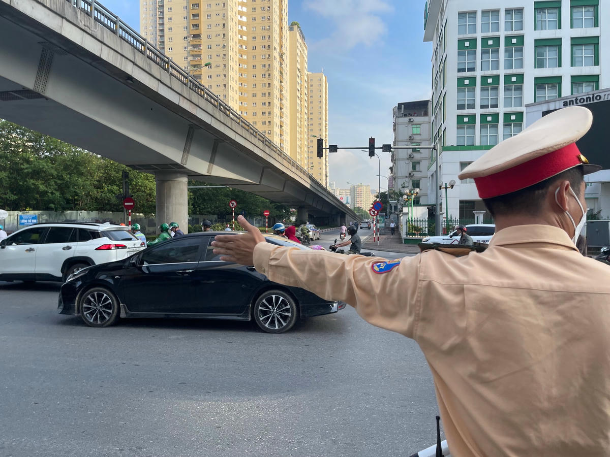 Sáng 24/6, theo quan sát của chúng tôi, trong giờ cao điểm tại nút giao Trần Duy Hưng - Hoàng Minh Giám - Nguyễn Chánh, giao thông thông thoáng, Cảnh sát giao thông tích cực hướng dẫn, phân luồng cho người tham gia giao thông đi đúng làn, đúng luồng.