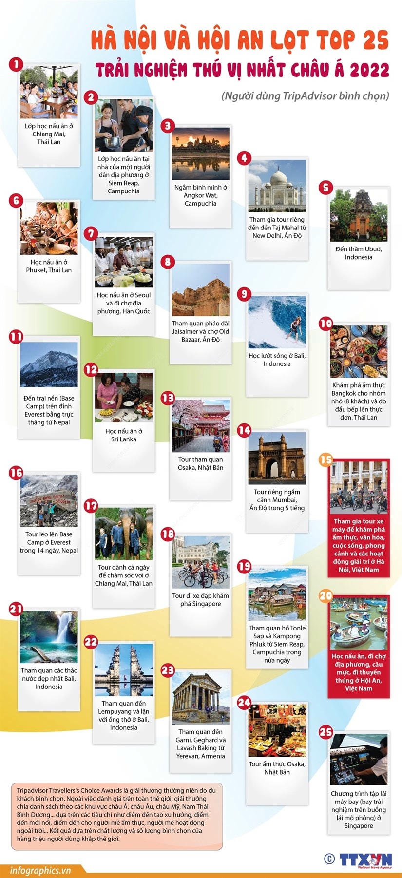Người dùng TripAdvisor đã bình chọn 25 trải nghiệm thú vị nhất châu Á 2022, trong đó có khám phá Hà Nội và Hội An của Việt Nam.