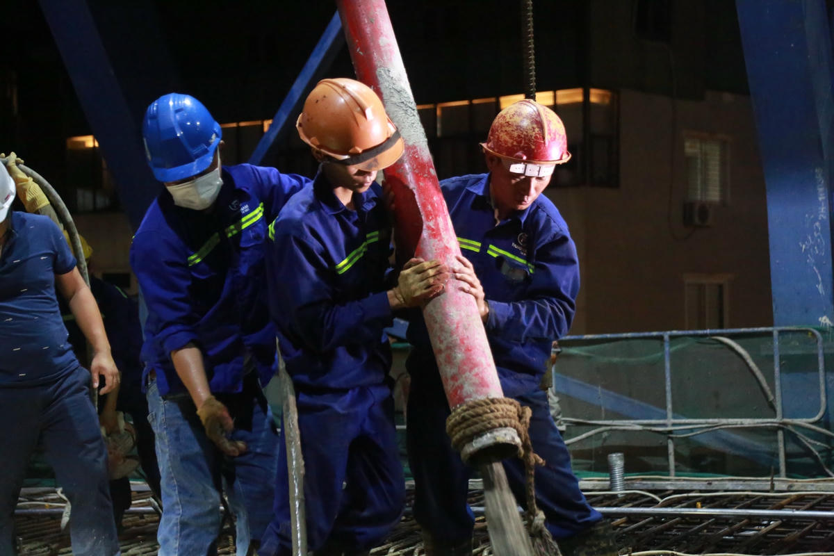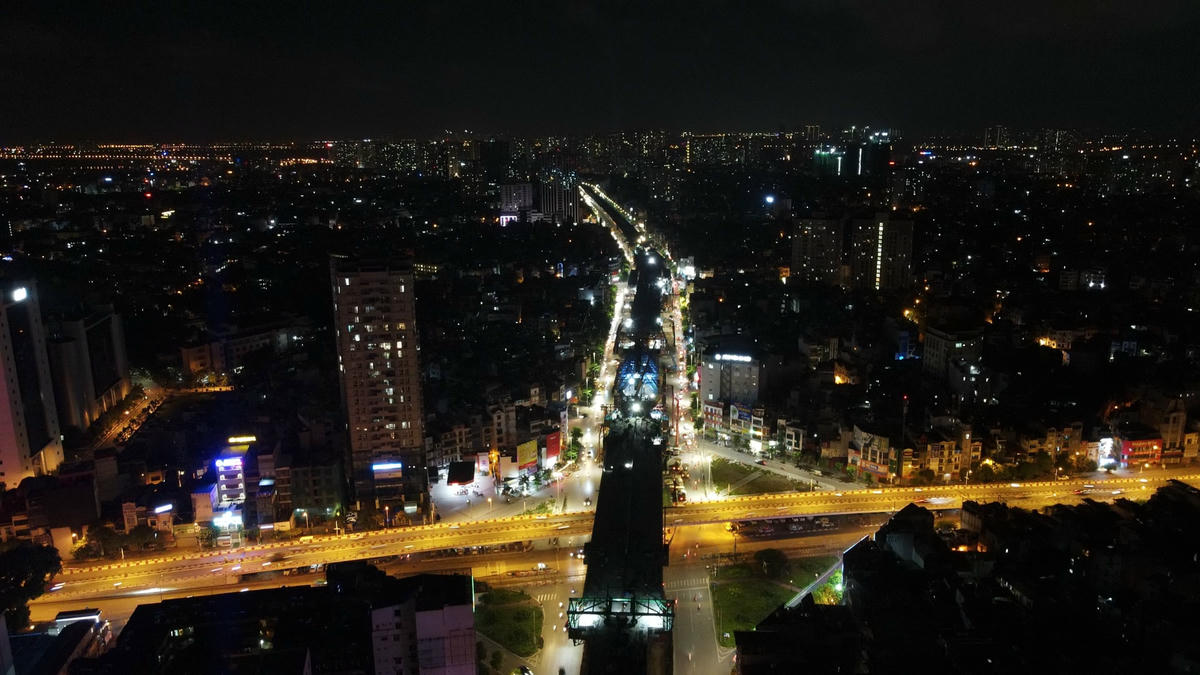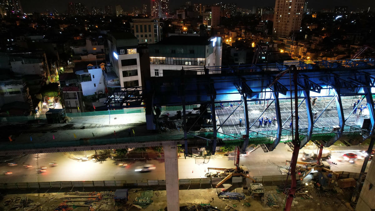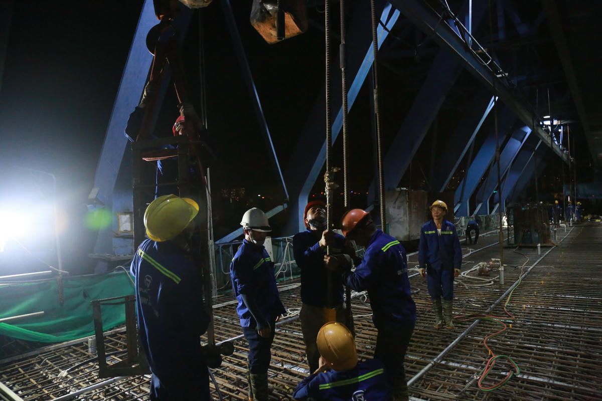 Đêm 14/7 trên công trường thi công dự án đường đai 2, hàng trăm công nhân đổ bê tông hợp long nhịp cầu cuối của dự án. Dự kiến đoạn trên cao từ cầu Vĩnh Tuy đến Ngã Tư Vọng sẽ thông xe vào cuối tháng 12/2022.