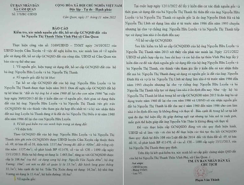 “Như vậy hộ bà Nguyễn Thị Thanh kê khai trong hồ sơ cấp GCNQSDĐ năm 2013 là do ông bà sử dụng trước năm 1960 để lại cho con năm 1986 và UBND xã xác nhận nguồn gốc đất bà Nguyễn Thị Thanh là đất cha mẹ ở năm 1960 đến năm 1986 cho con làm nhà ở ổn định đến nay là không đúng với thực tế”, báo cáo nêu rõ.