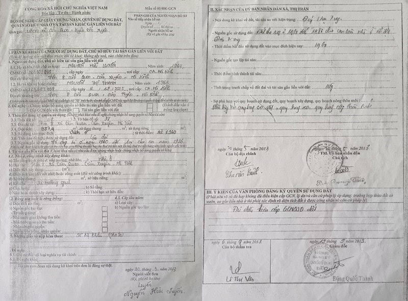 Tuy nhiên, trong Đơn đề nghị cấp giấy chứng nhận quyền sử dụng đất, quyền sở hữu nhà ở và tài sản gắn liền với đất, đối với thửa đất số 49, tờ bản đồ số 38, tại thôn 8 xã Cẩm Quan ghi ngày 30/3/1013, ông Nguyễn Hữu Luyến lại khai là đất sử dụng từ thời điểm 1960; nguồn gốc sử dụng, do ông bà ở năm 1960, để lại cho con năm 1986.