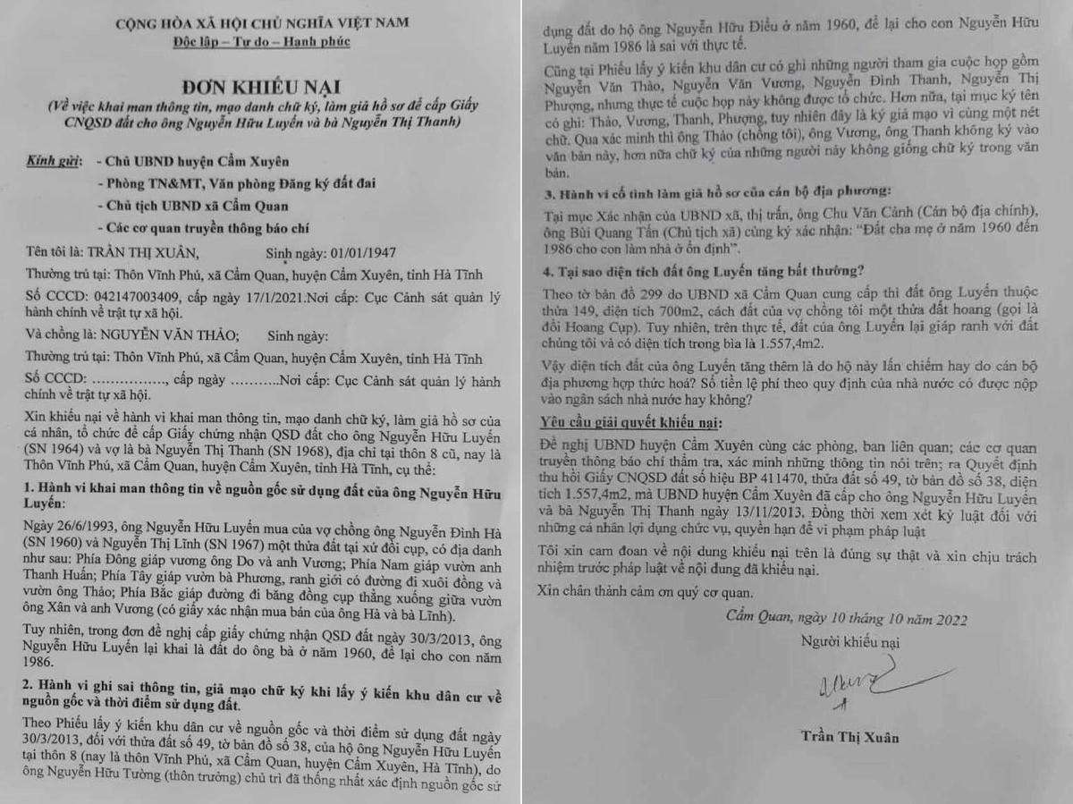 Vừa qua, PV Đại Đoàn Kết nhận được thông tin phản ánh của bà Trần Thị Xuân (SN 1947; chồng là Nguyễn Văn Thảo, SN 1945, trú tại thôn Vĩnh Phú, xã Cẩm Quan, huyện Cẩm Xuyên, tỉnh Hà Tĩnh) về việc ông Nguyễn Hữu Luyến (SN 1964) và vợ là bà Nguyễn Thị Thanh (SN: 1963, cùng trú ở thôn Vĩnh Phú, xã Cẩm Quan) đã khai man nguồn gốc sử dụng đất, dẫn đến thôn mạo danh chữ ký, xã làm giả hồ sơ để cấp Giấy CNQSD đất trái quy định.