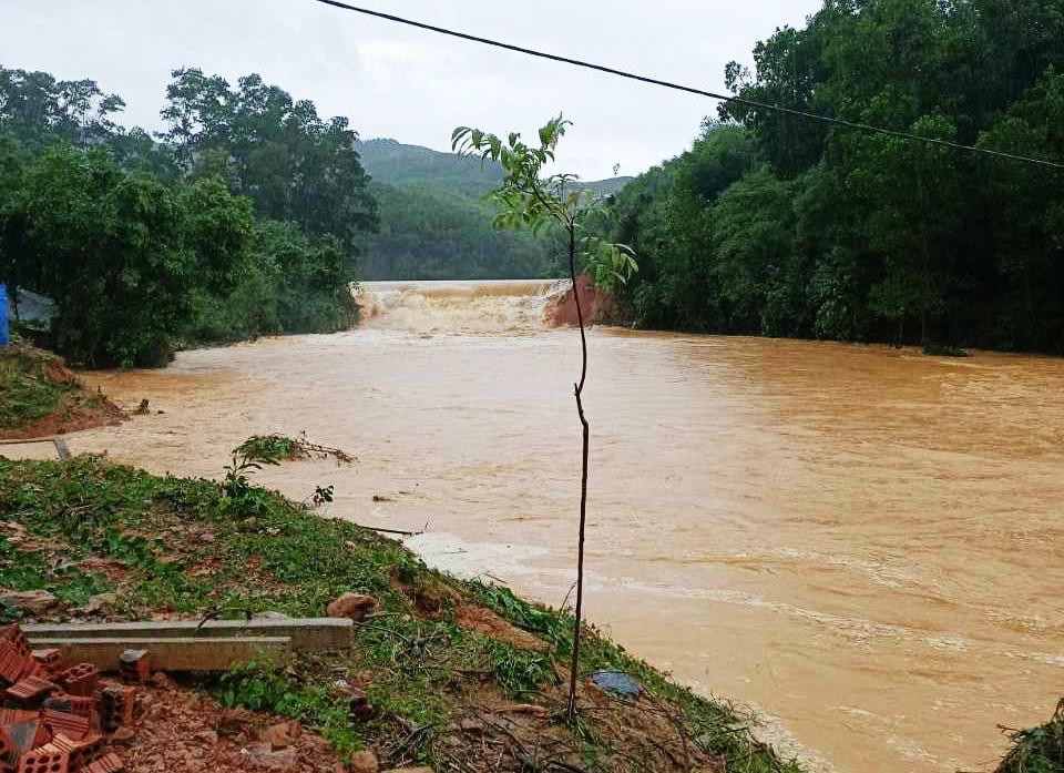 Nước lũ dâng cao khiến thân đập Tắt (xã Hoà Hải, huyện Hương Khê, tỉnh Hà Tĩnh) bị vỡ, hàng chục hecta hoa màu bị cuốn trôi.