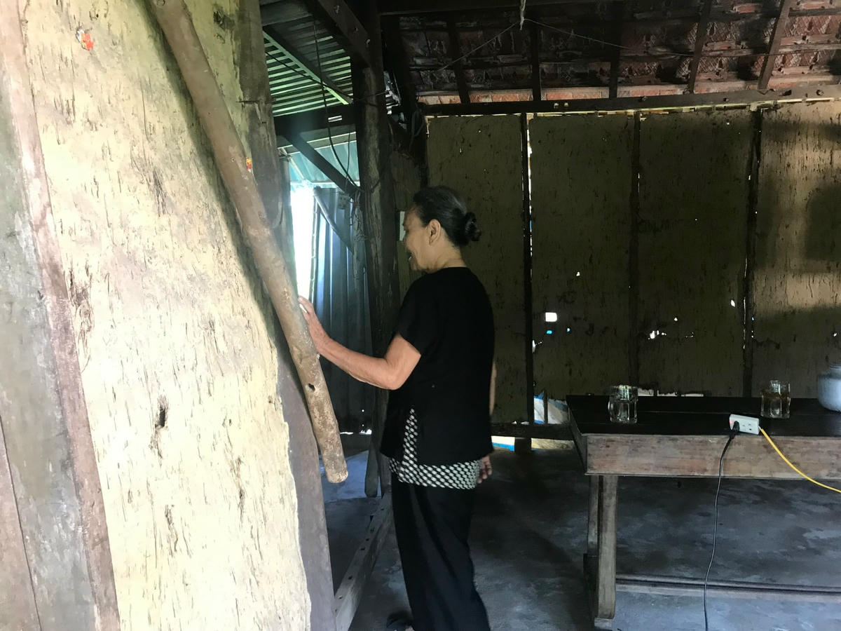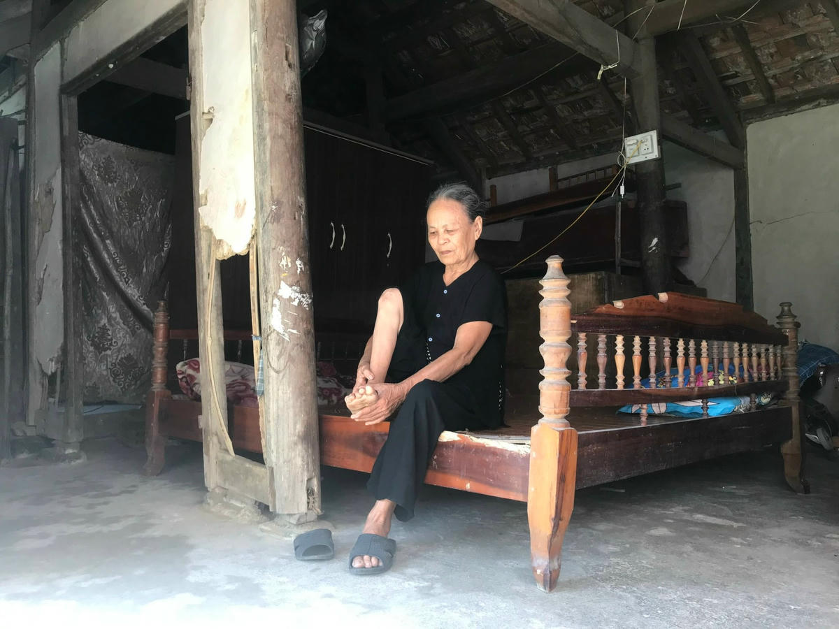 Ngôi nhà tạm bợ của bà Thỉ xây dựng từ thửa xưa, khi còn trộn bùn với rơm rạ để trát vách, giờ đây nhà không còn chỗ nào vững chãi, tứ phía bị mối mọt, xiên xẹo. Chắc chỉ cần vài trận mưa nữa là toàn bộ gia sản của cụ bà 78 tuổi sập xuống.