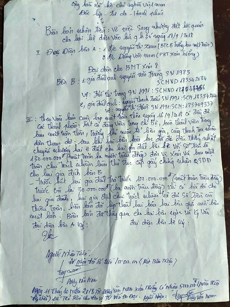 Ông Nam bán đất với giá 130 triệu đồng, đã nhận của ông Long 2 lần với số tiền 105 triệu đồng. Số tiền bán đất, ông Nam chi vào việc làm các hạng mục của nhà văn hóa thôn 8 như xây tường rào, làm sân bê tông, xây cổng, cột cờ… và đưa cho ông Hoàng Văn Trung 5 triệu đồng để chi cho đoàn đo đạc đất.