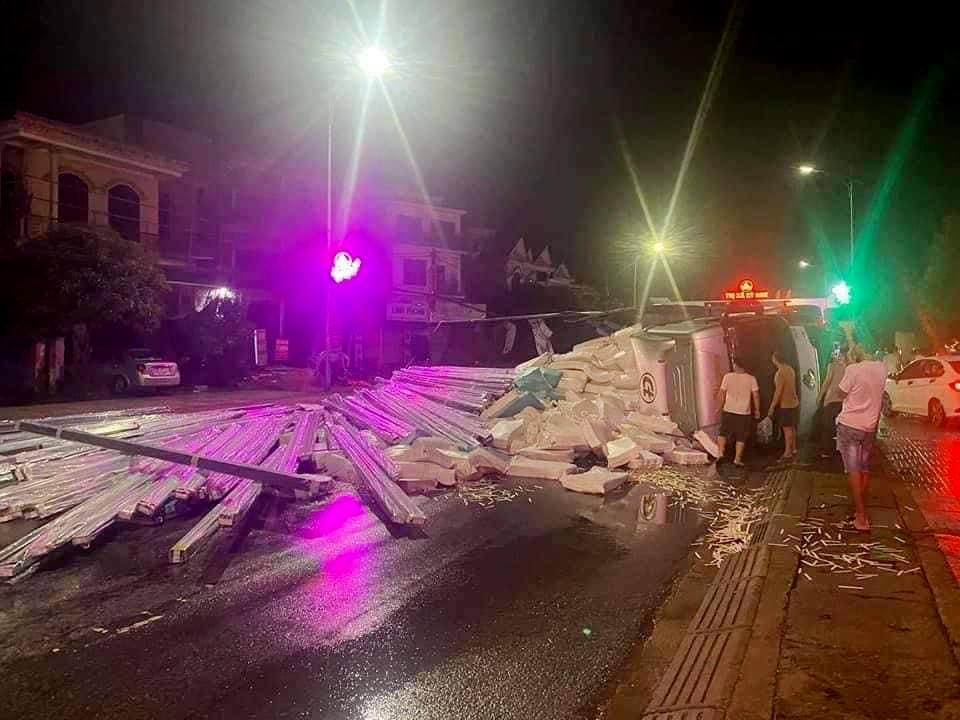 Theo người dân chứng kiến, chiếc xe ô tô 5 chỗ có dấu hiệu chạy lấn làn nên buộc chiếc xe tải phải đánh lái gấp dẫn đến bị lật.